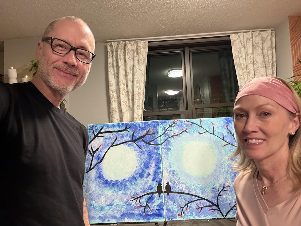 We recommend our Date Night Studio or our Date Night Essentials Kit For a date night diptych experience. You will paint one half of the painting on one canvas and your partner will paint the other half on another canvas. Each of you will have your own supplies.
