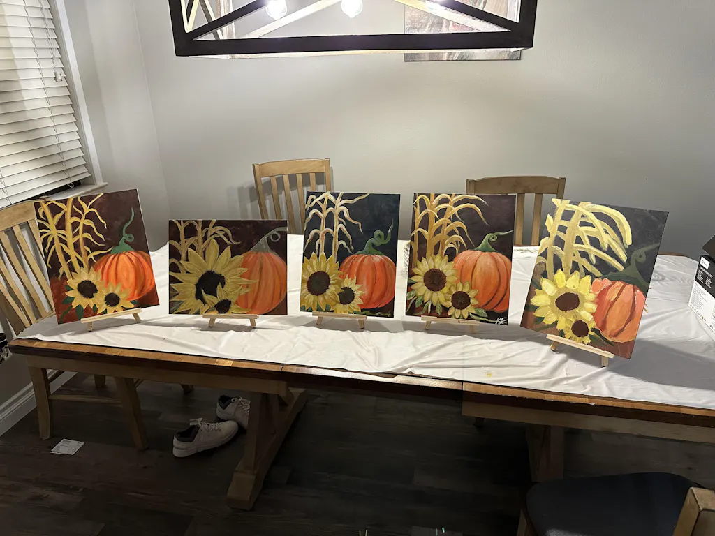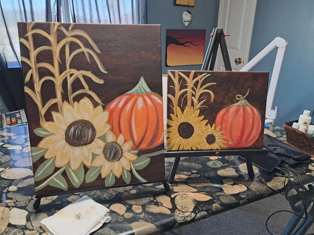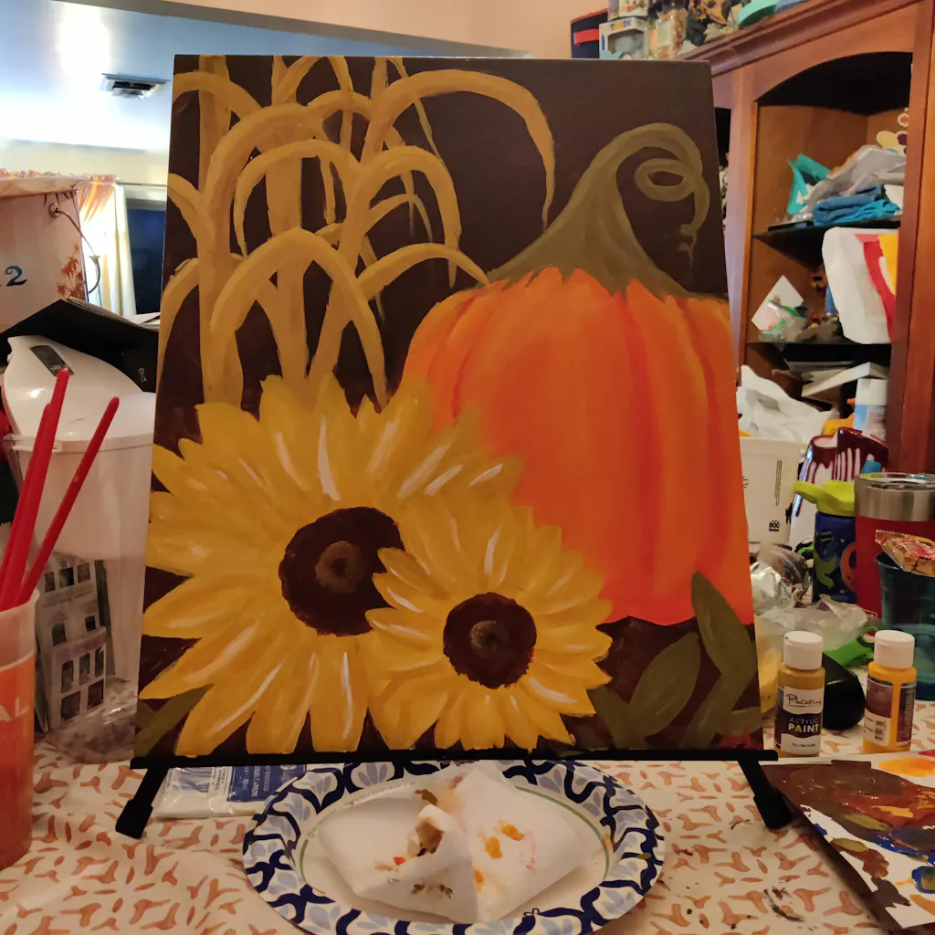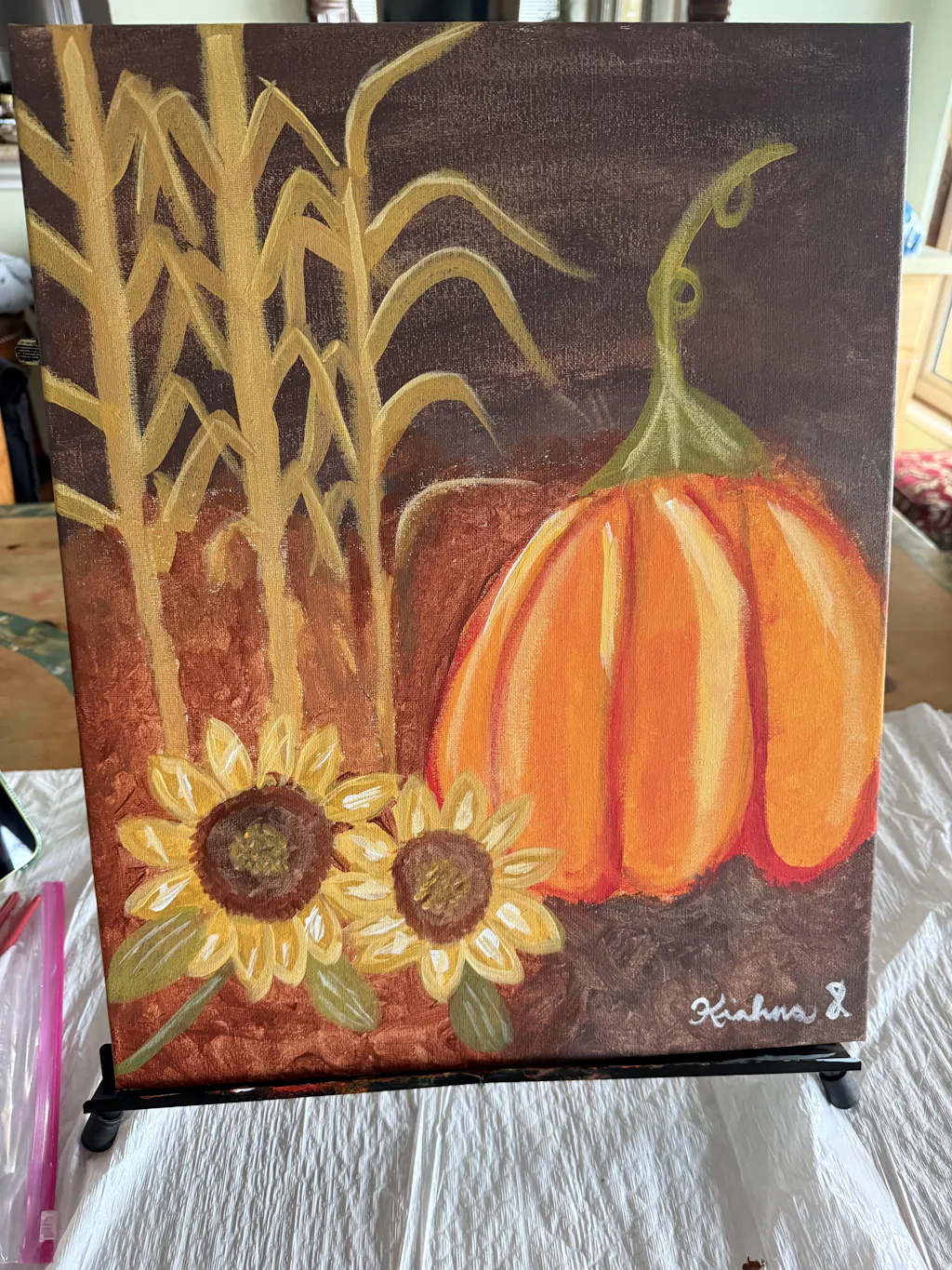 Fall in love with fall in this lovely painting of a pumpkin, sunflowers, and corn stalks. This painting will go great with your fall decor!