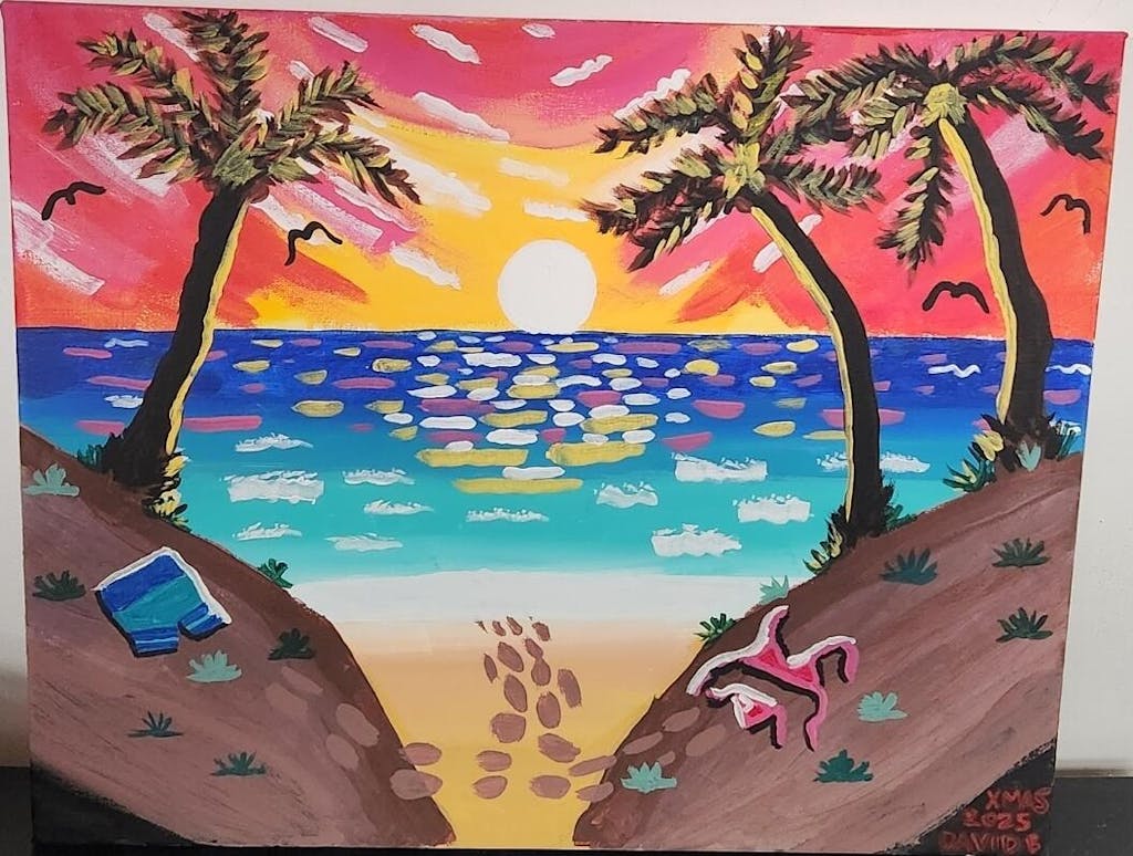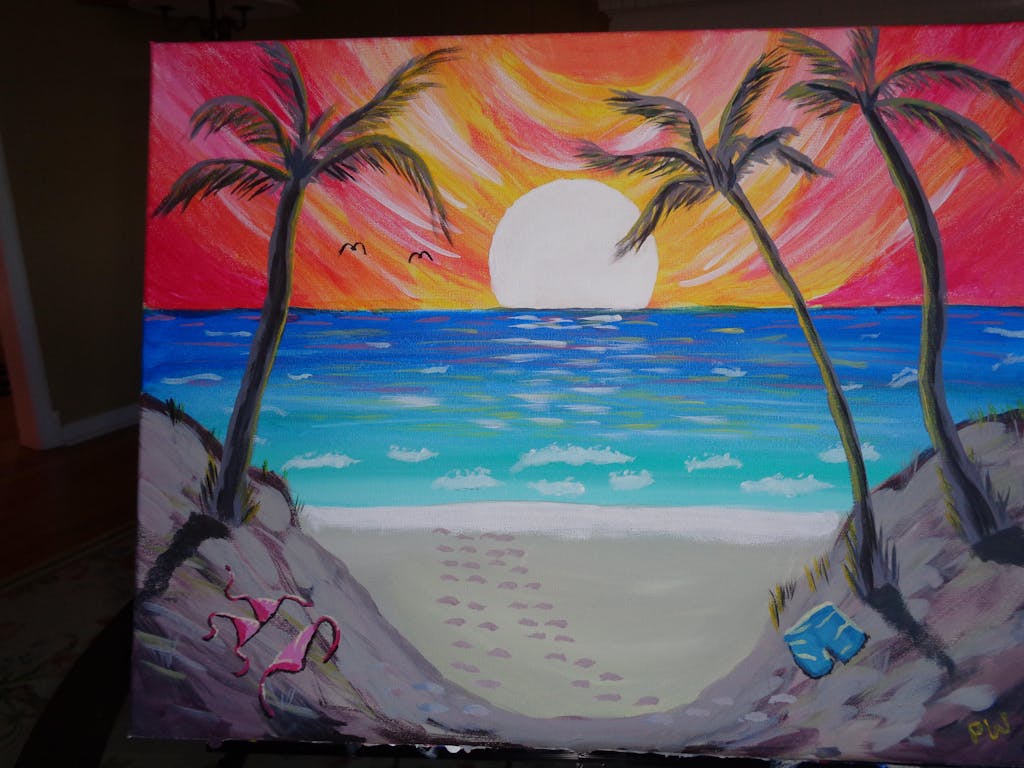 Our most scandalous painting yet! Swimsuits are optional for this romantic sunset swim. (Wearing an apron is still recommended.) Combine both sides of this golden-hour beach scene onto a single canvas, or collaborate with a partner across two canvases for a full panoramic view that’s sure to catch everyone's attention.