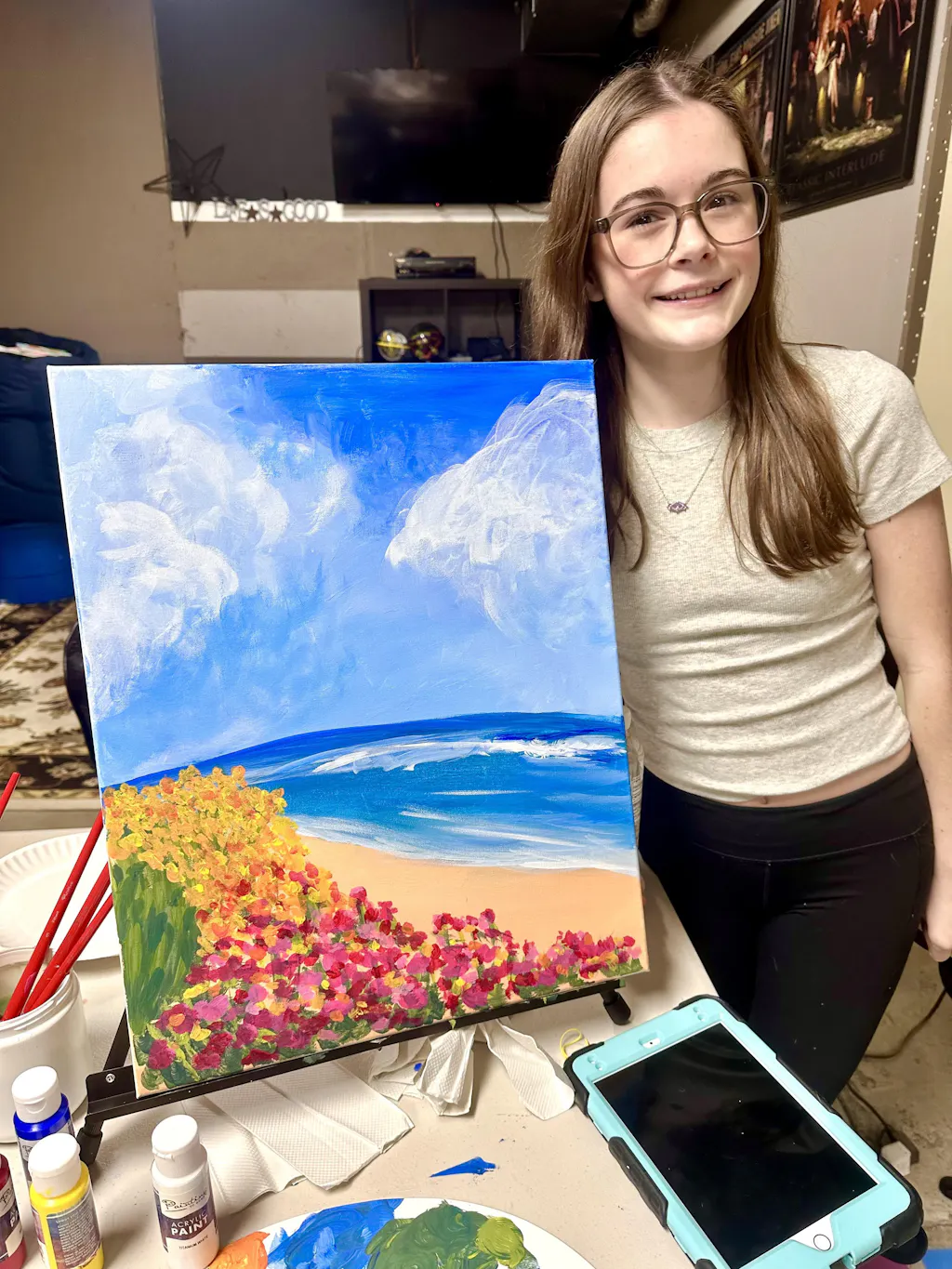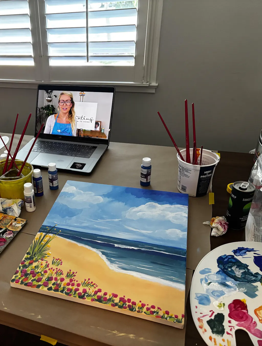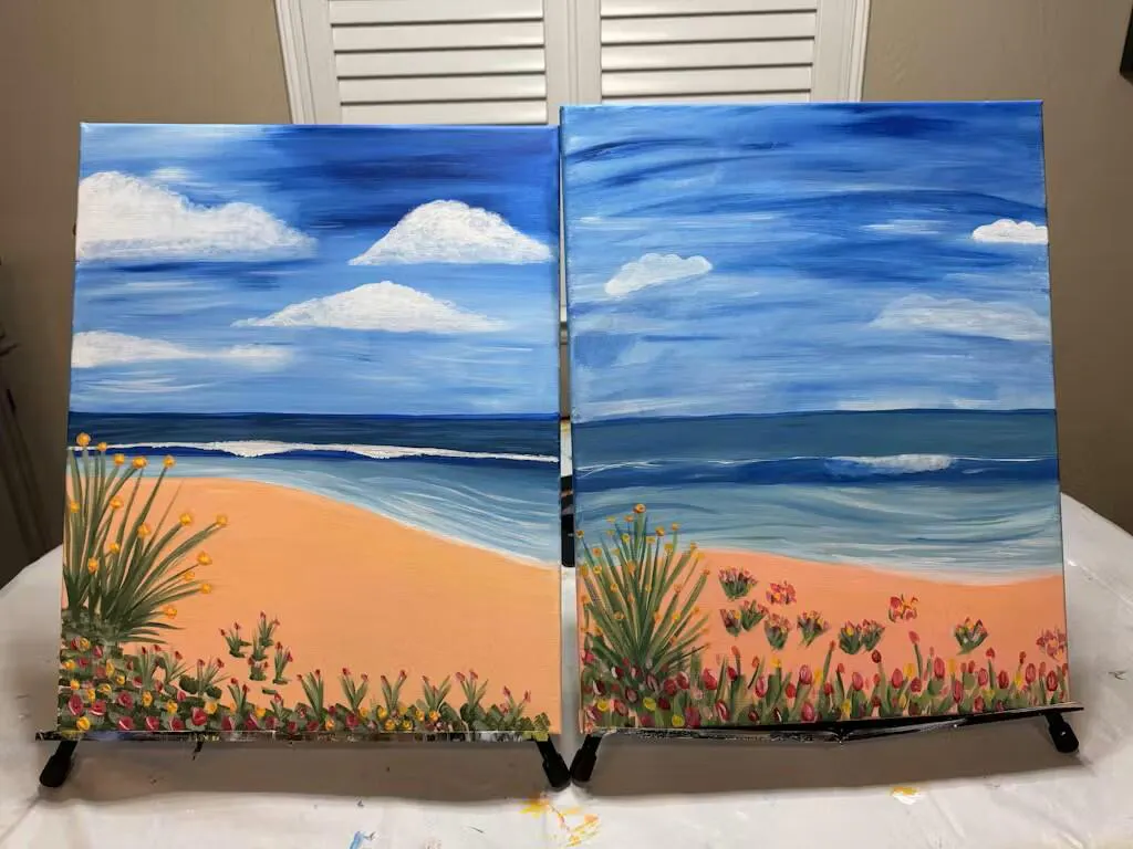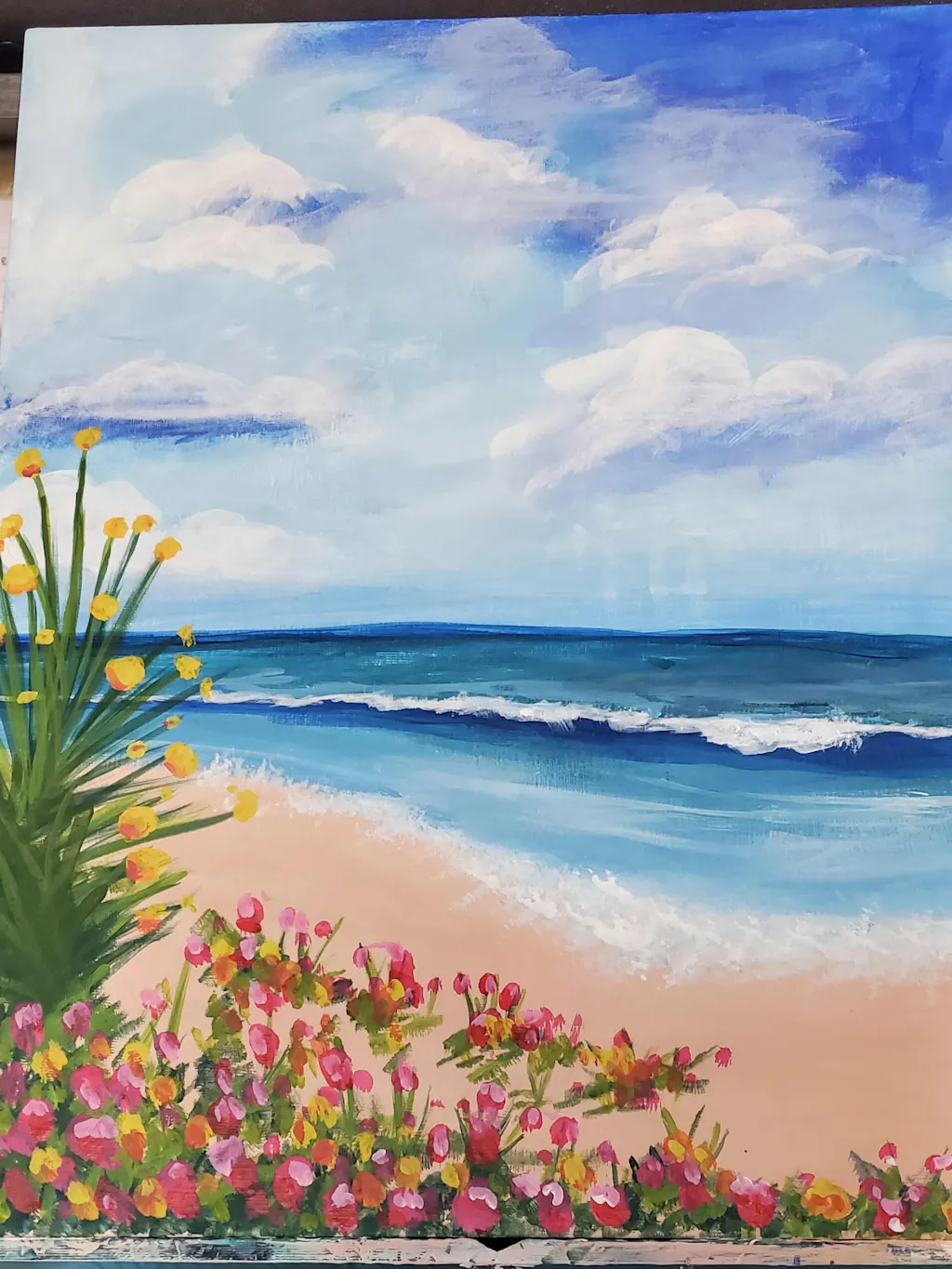 Using easy layering and blending techniques, this painting experience is as breezy as a stroll along the shore. Fluffy white clouds, gentle waves, and vibrant flowers dotting the beach dunes make this painting a window to a tranquil escape.