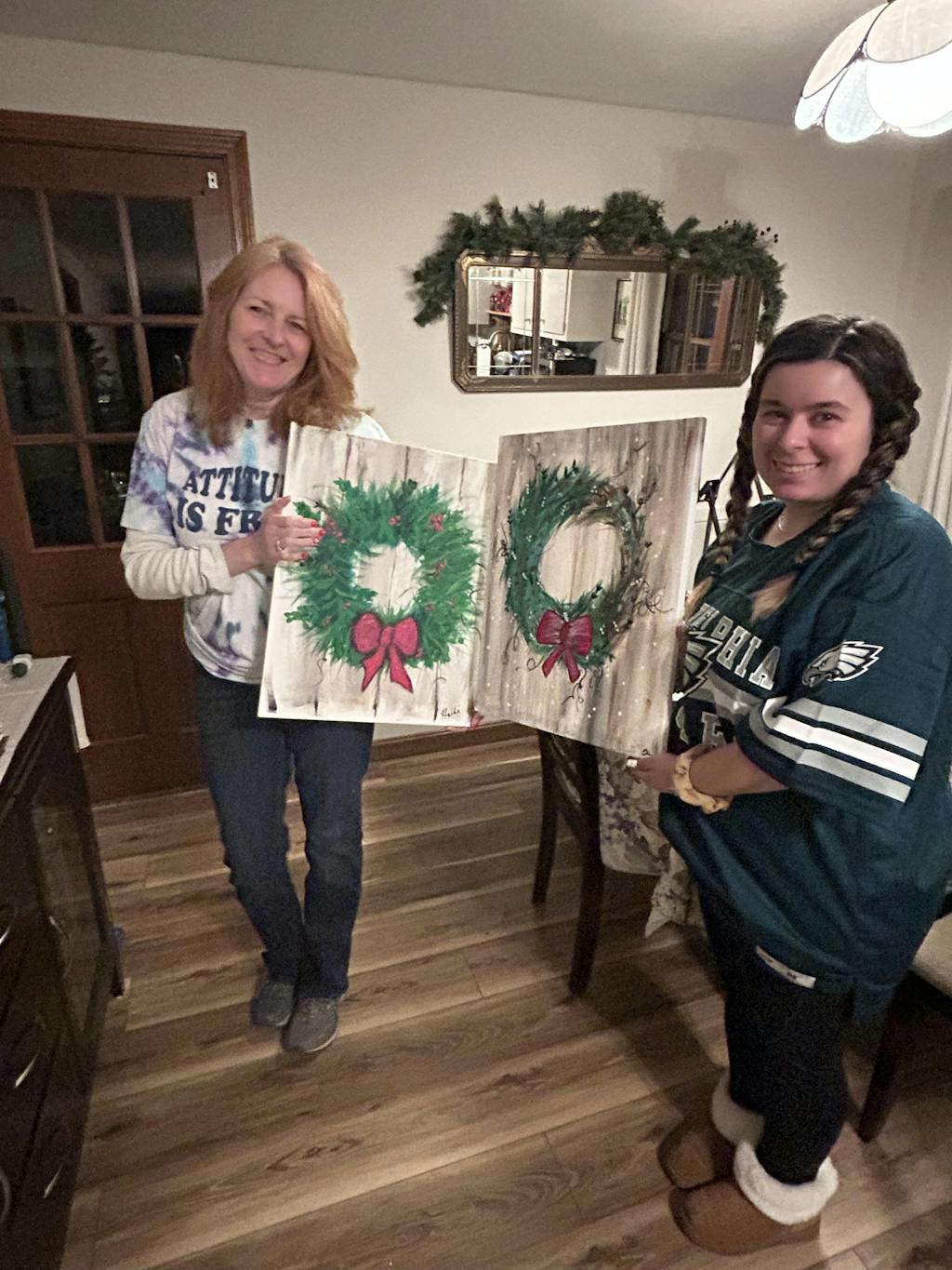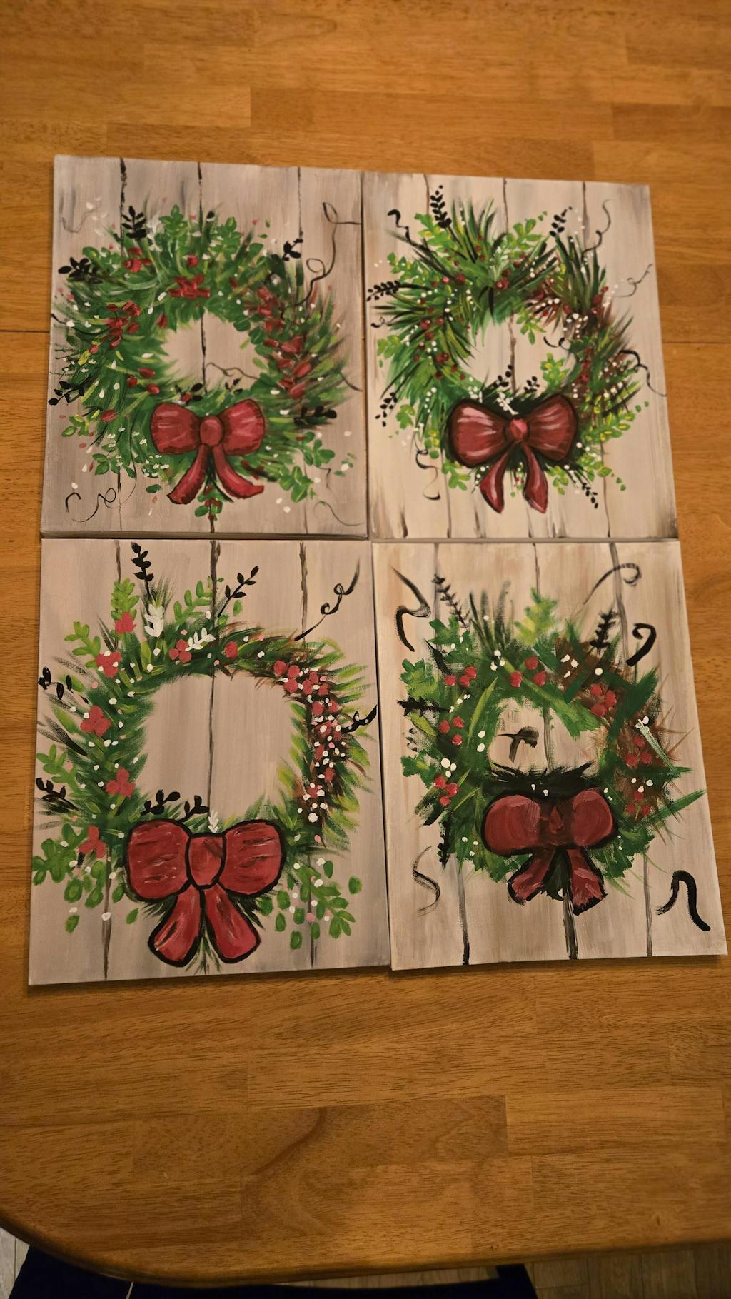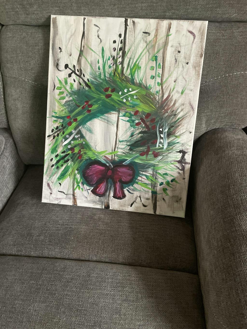 Adorn your space with this warm and welcoming holiday wreath. Layer a variety of brush strokes and colors to create the rich textures of evergreen boughs and holly berries, all tied up with a bow!