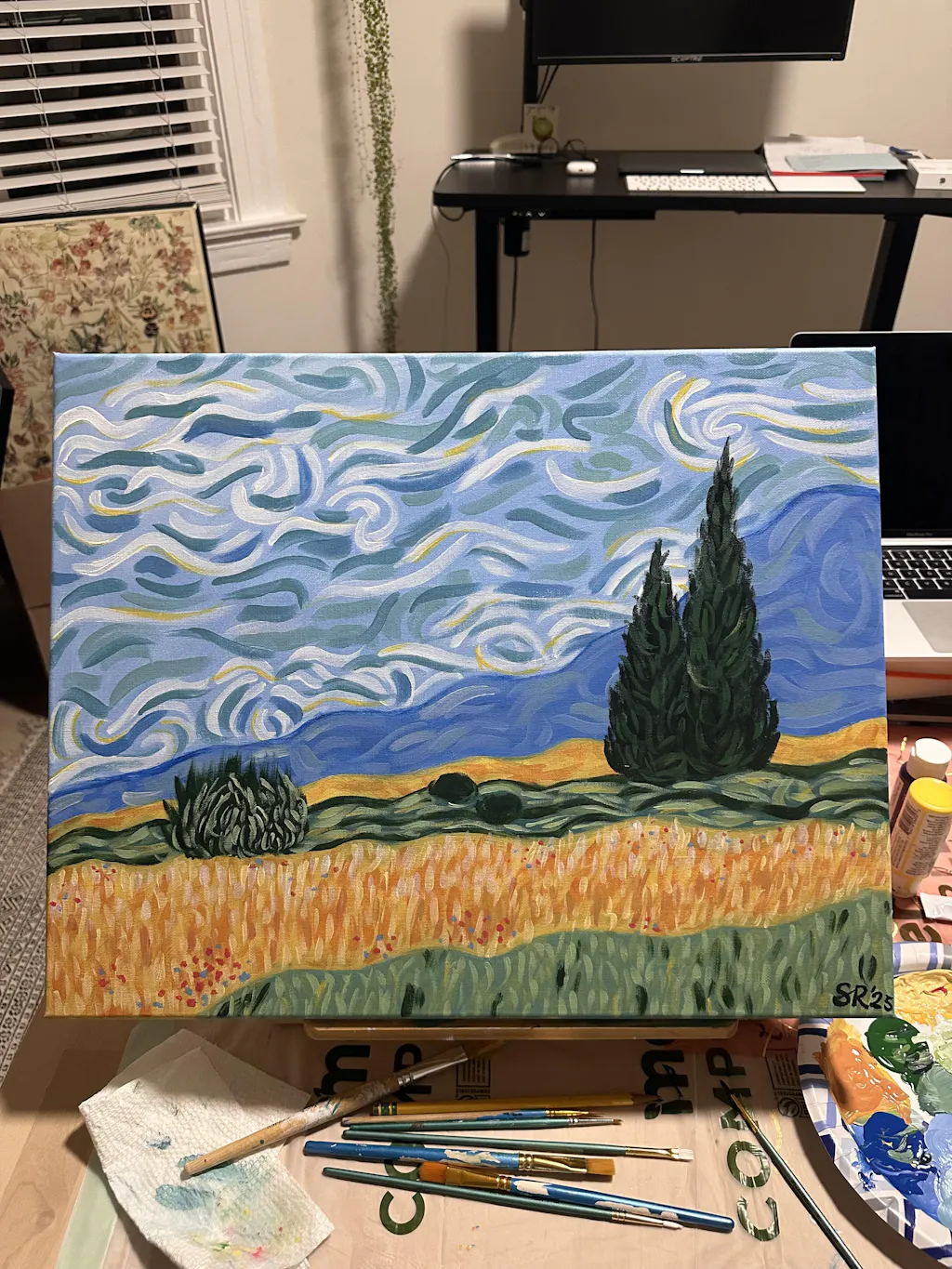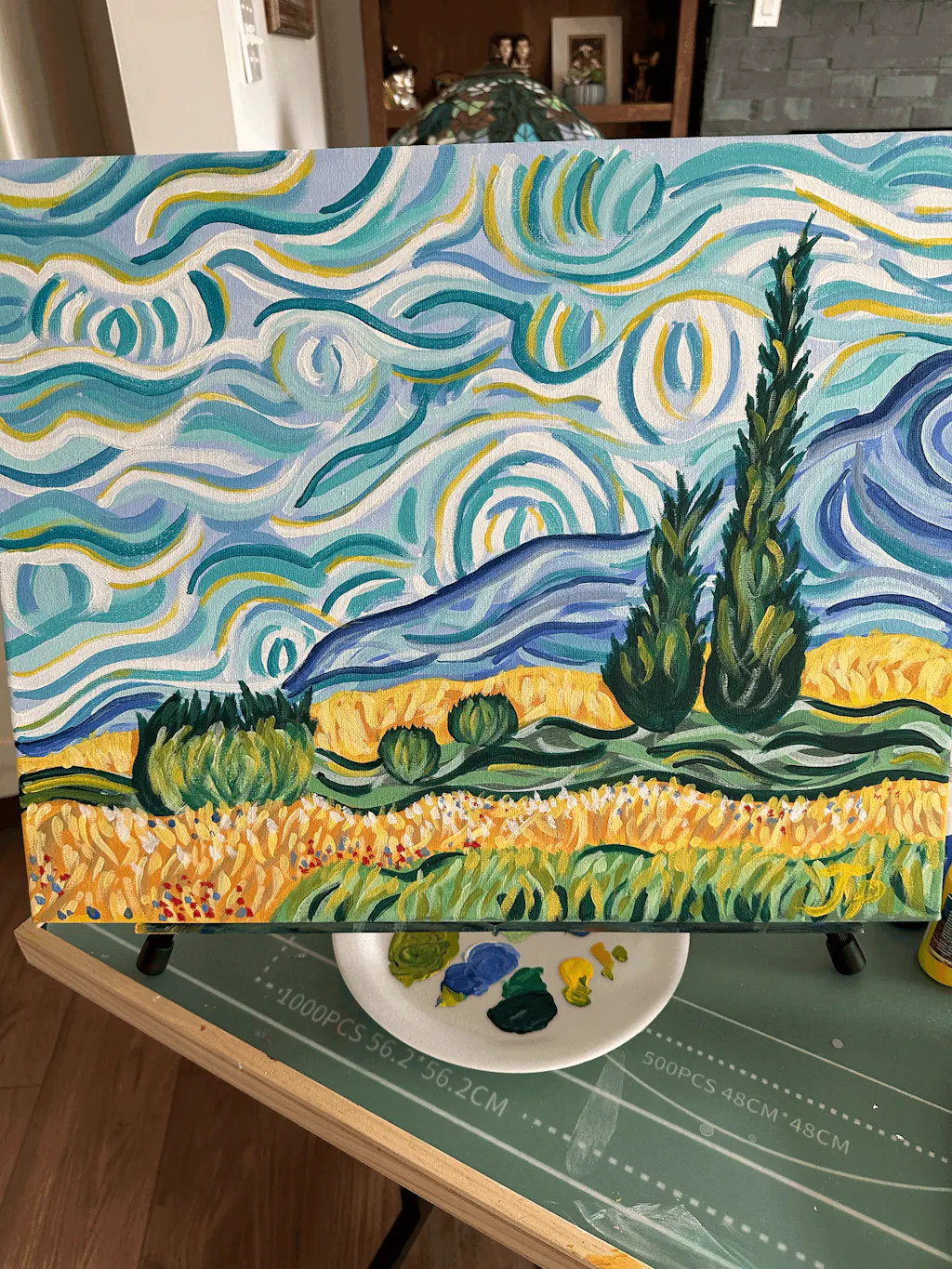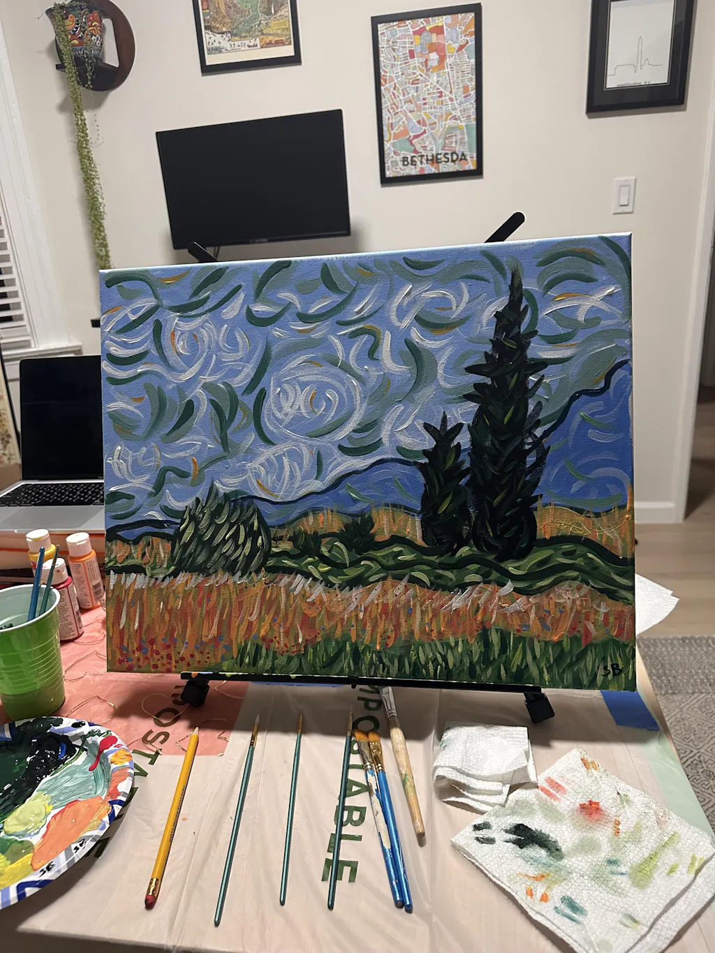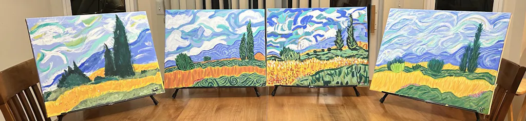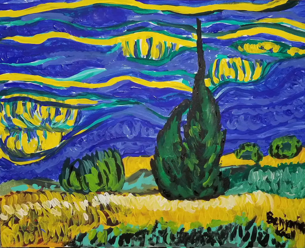Let this breezy rendition of Vincent van Gogh's famous "Wheatfield with Cypresses" transport you to the sunnier side of "Starry Night." Channel your inner expressionist (without endangering your ears!) with this easygoing painting experience that turns out beautifully at any skill level.