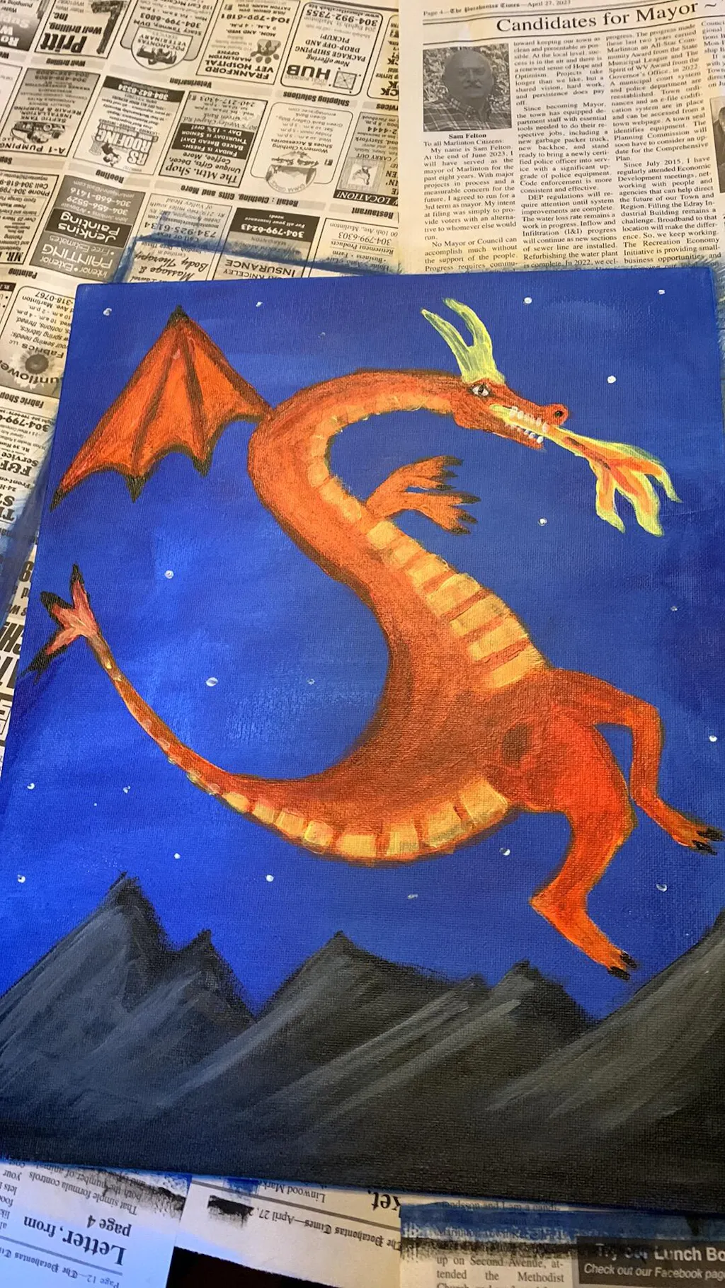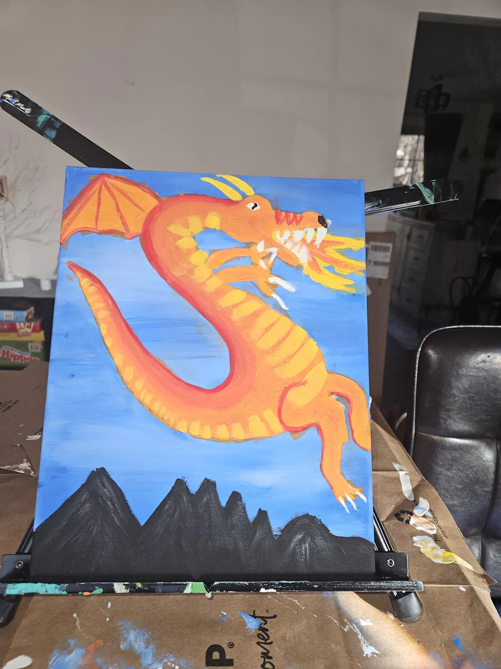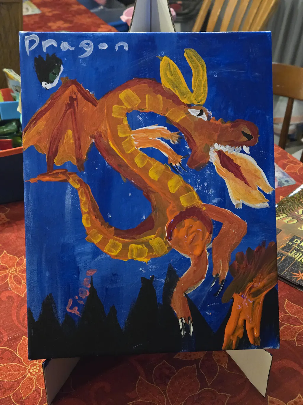 Fanciful friend or fearsome foe? It’s up to you! With a swish of your favorite brush, paint this magnificent fire-breathing dragon flying over mountain peaks below! Here’s a hint: if you can write the alphabet, you can make this painting!