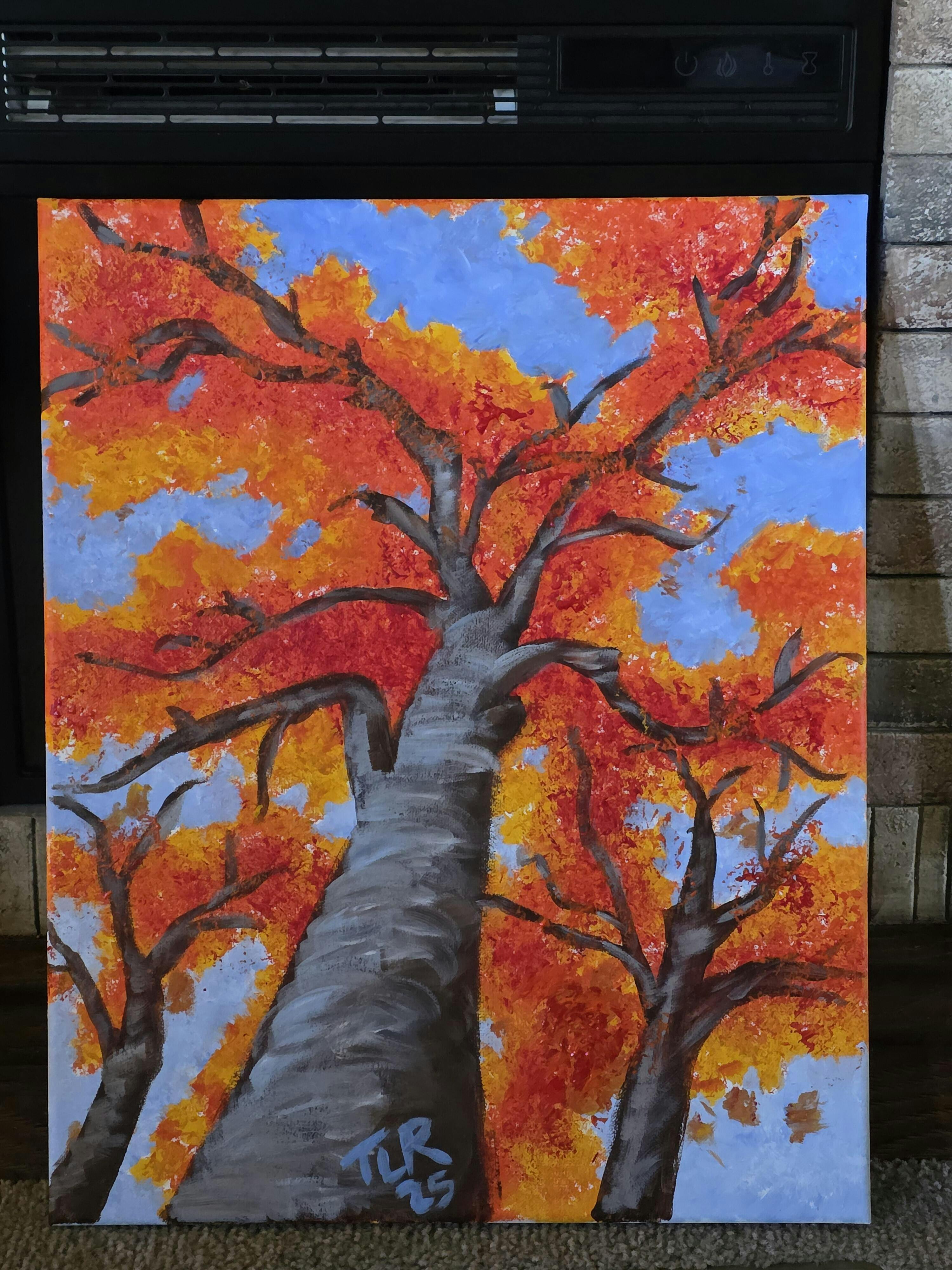 Look up to see the changing autumn leaves set the sky ablaze with fiery hues against azure blues. Learn how to use perspective to give this painting the feel of looking up into the sky for a celebration of glorious fall foliage that will look brilliant on your wall all year round!