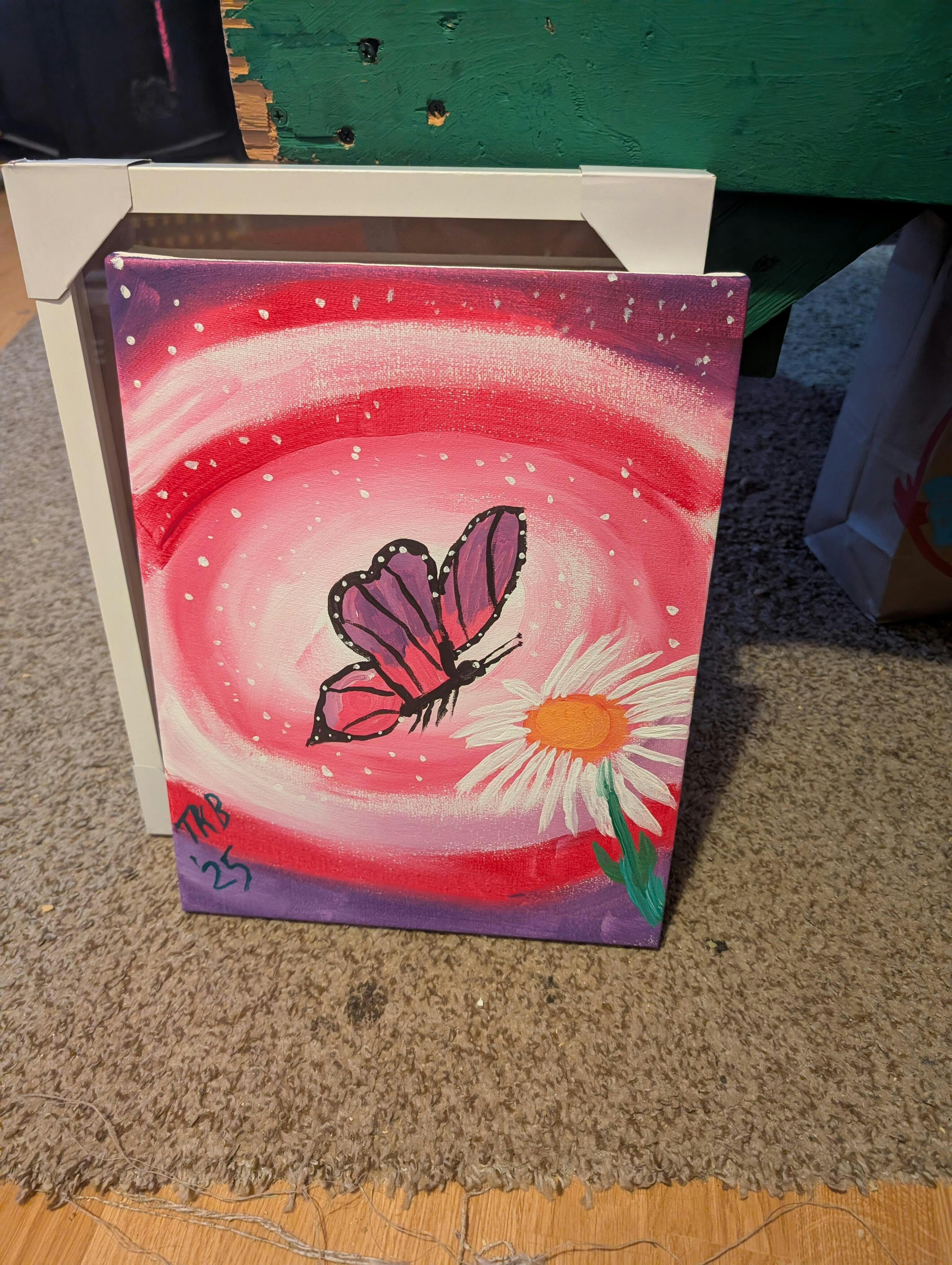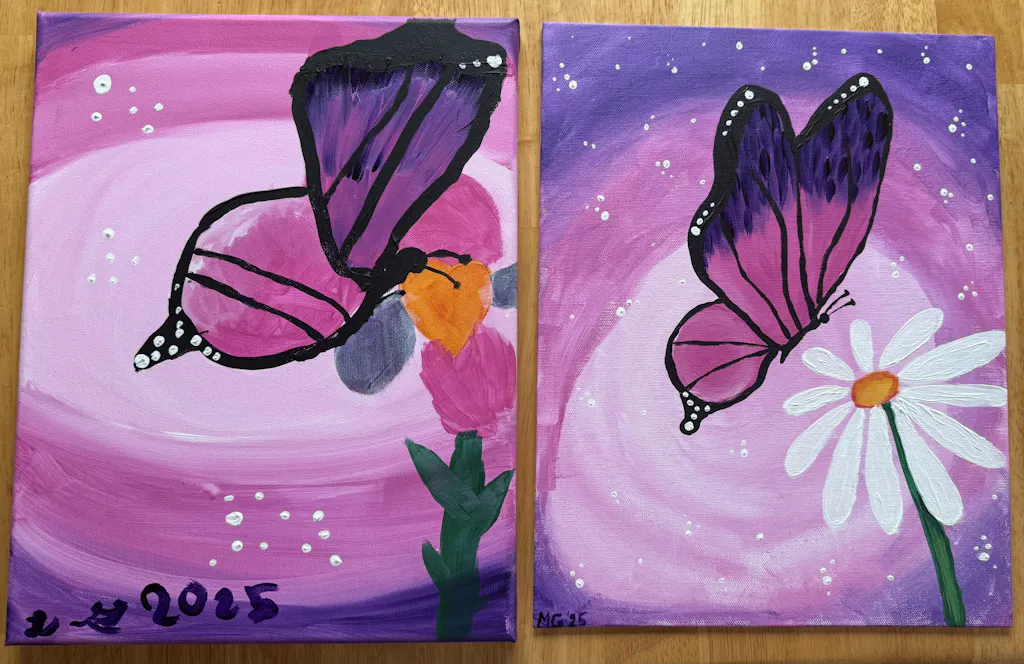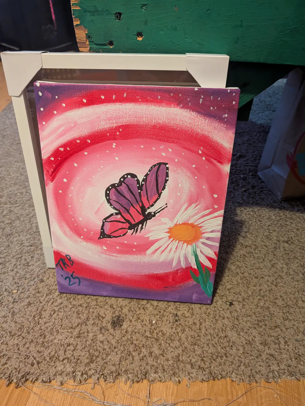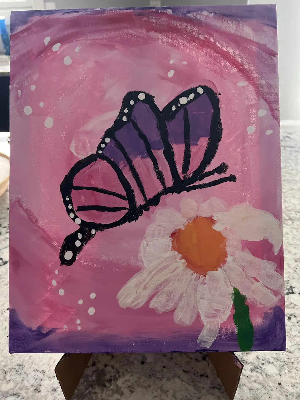 A cheerful butterfly dances above a daisy on a dreamy pink and purple background—perfect for young artists who love nature and color!