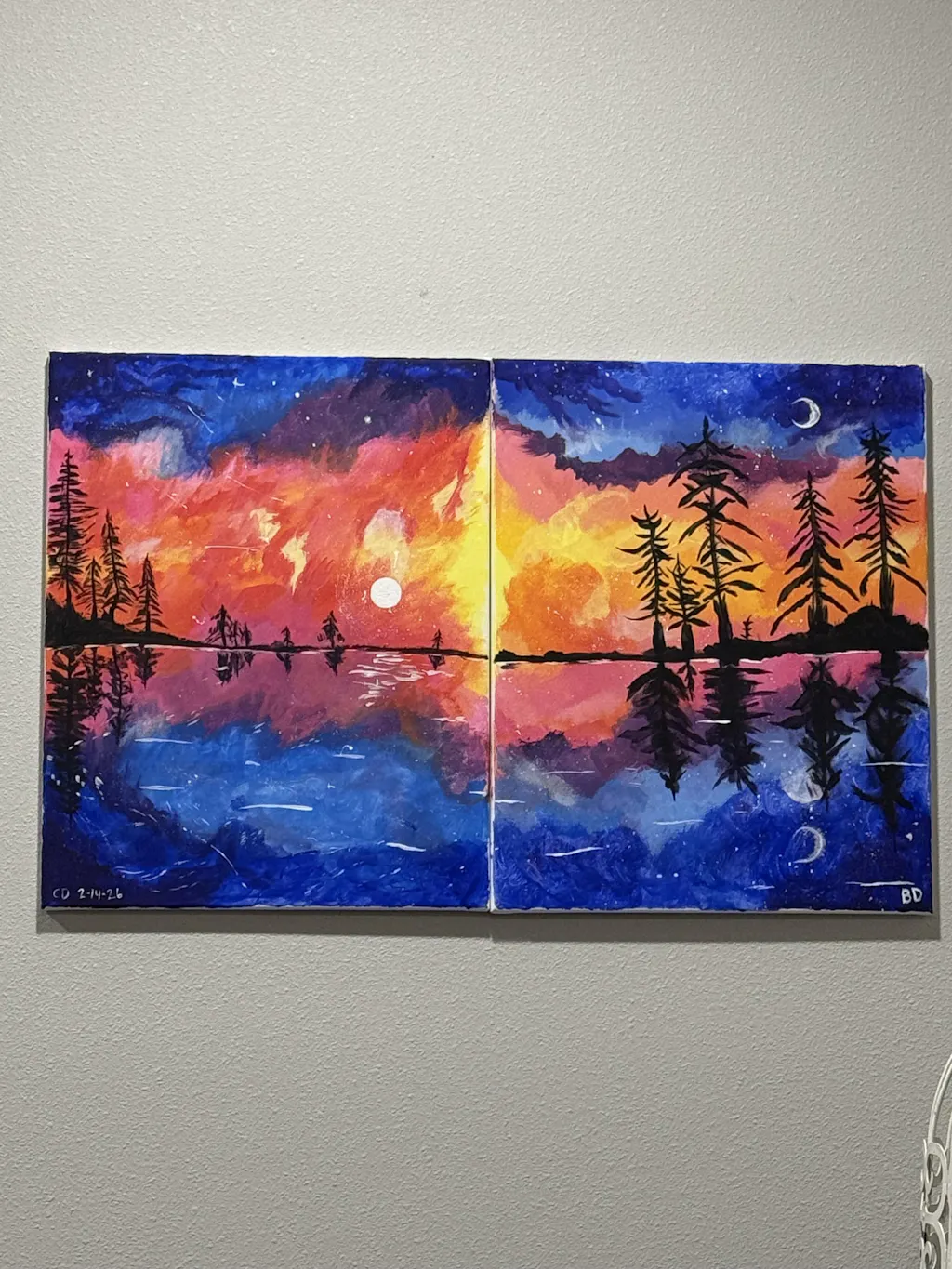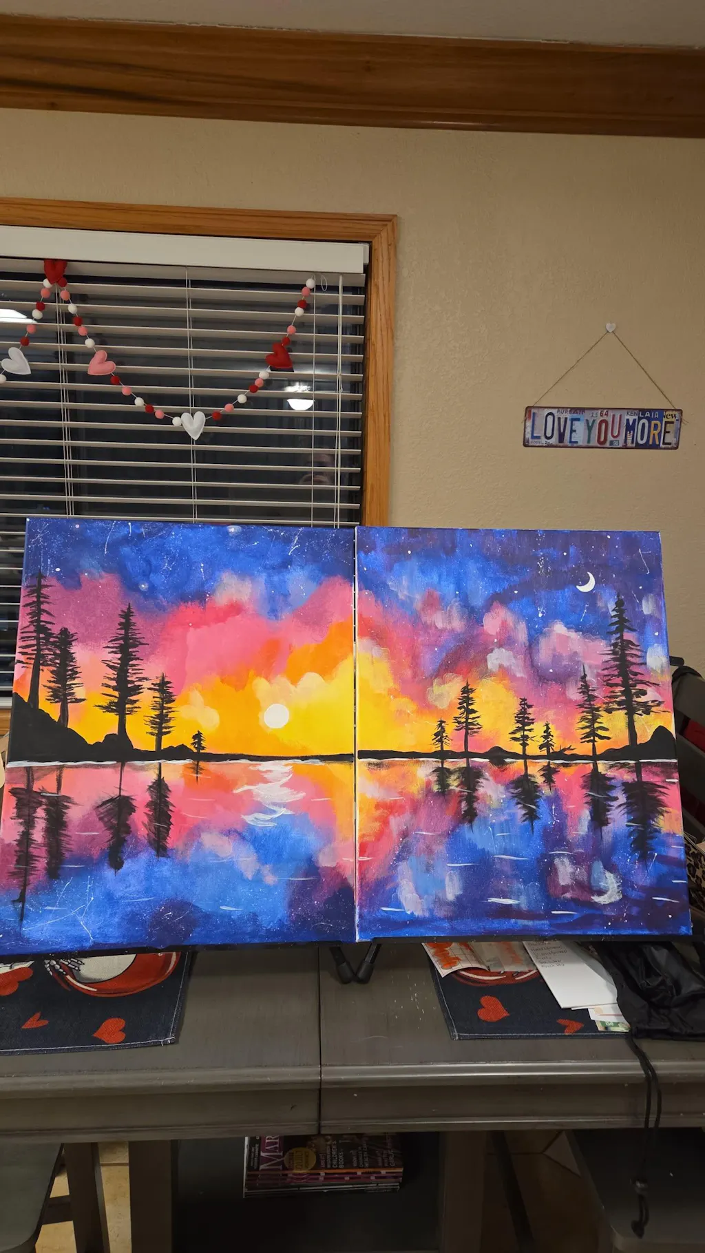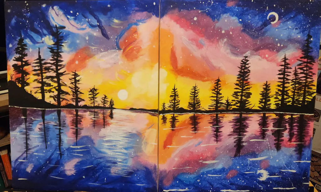 From resplendent sunset to mellow pastel sunrise, this painting captures the most beautiful moments of the morning and evening. Paint this entire landscape on a one canvas for a solo masterpiece, or partner together with your special someone and paint across two canvases for a visual reminder that the sun never sets on love.