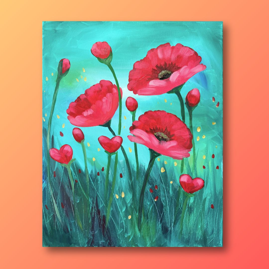 Hearts in Bloom is a joyful floral painting that celebrates connection, creativity, and self-expression. Vibrant red blooms rise from a softly textured field, accented with subtle heart details and set against a calming teal sky.