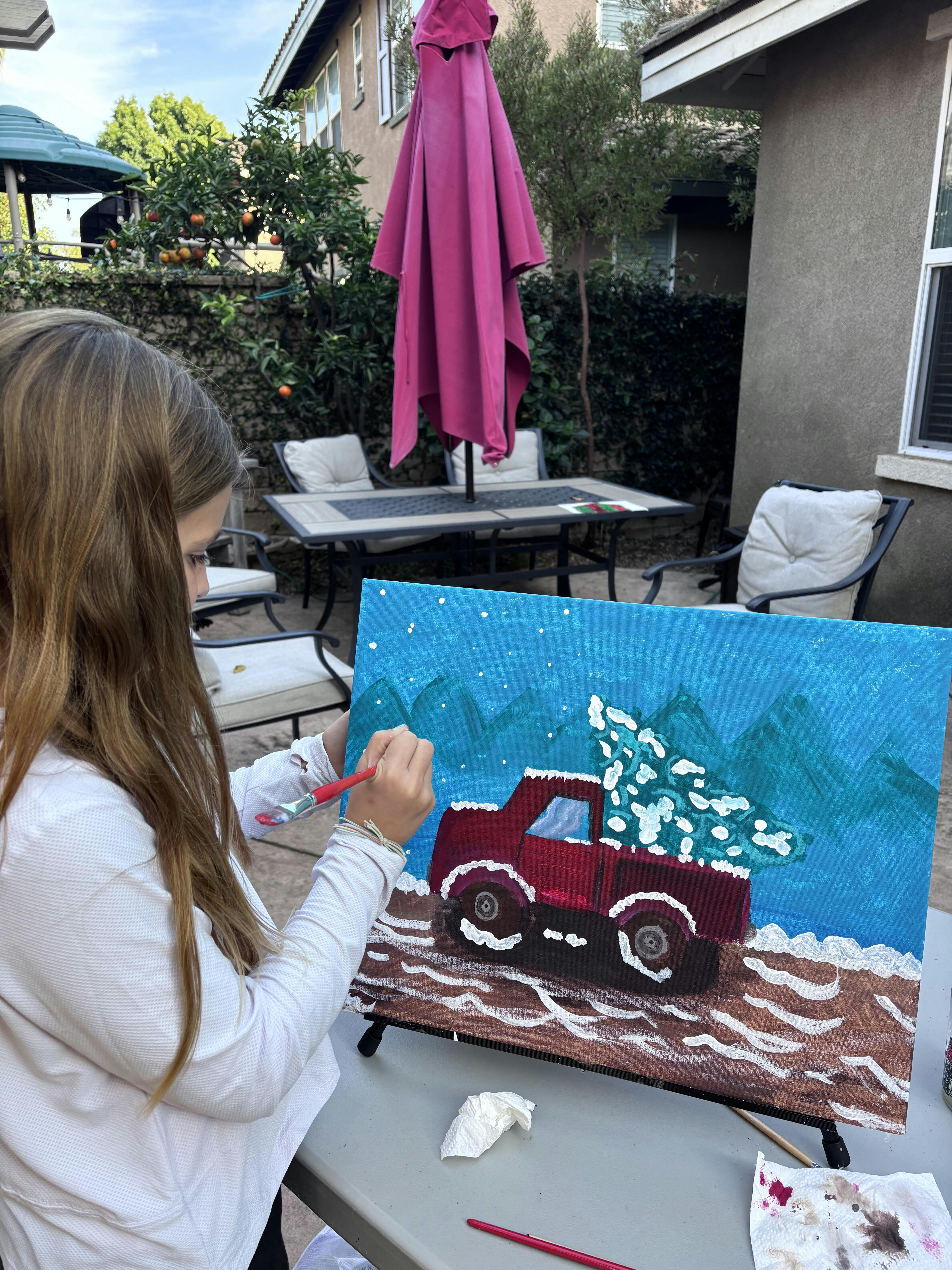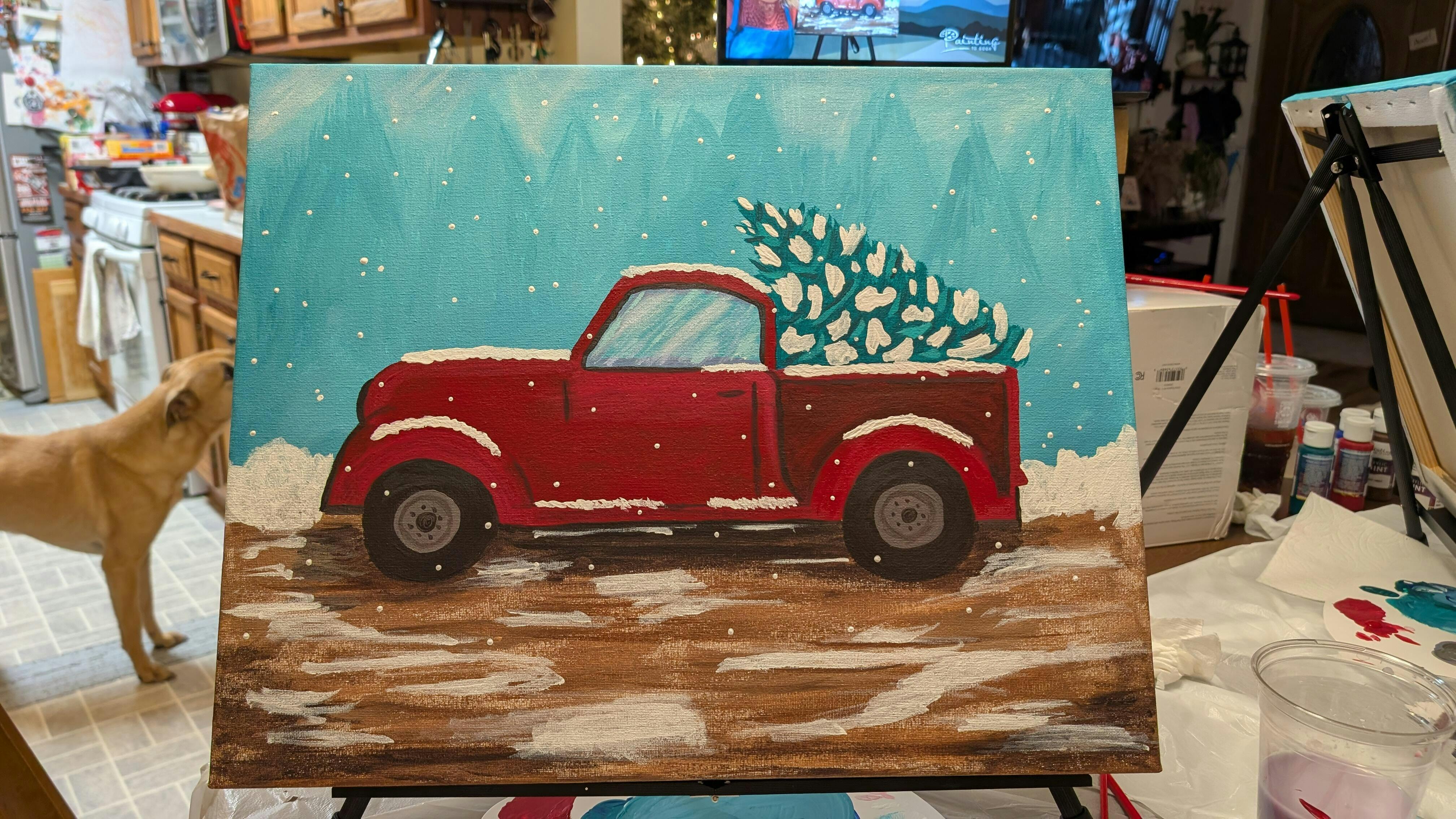 Is your favorite holiday tradition picking out a Christmas tree? Create a beautiful winter scene with an old red pickup truck carrying a Christmas tree through the snow. Fun for the whole family.