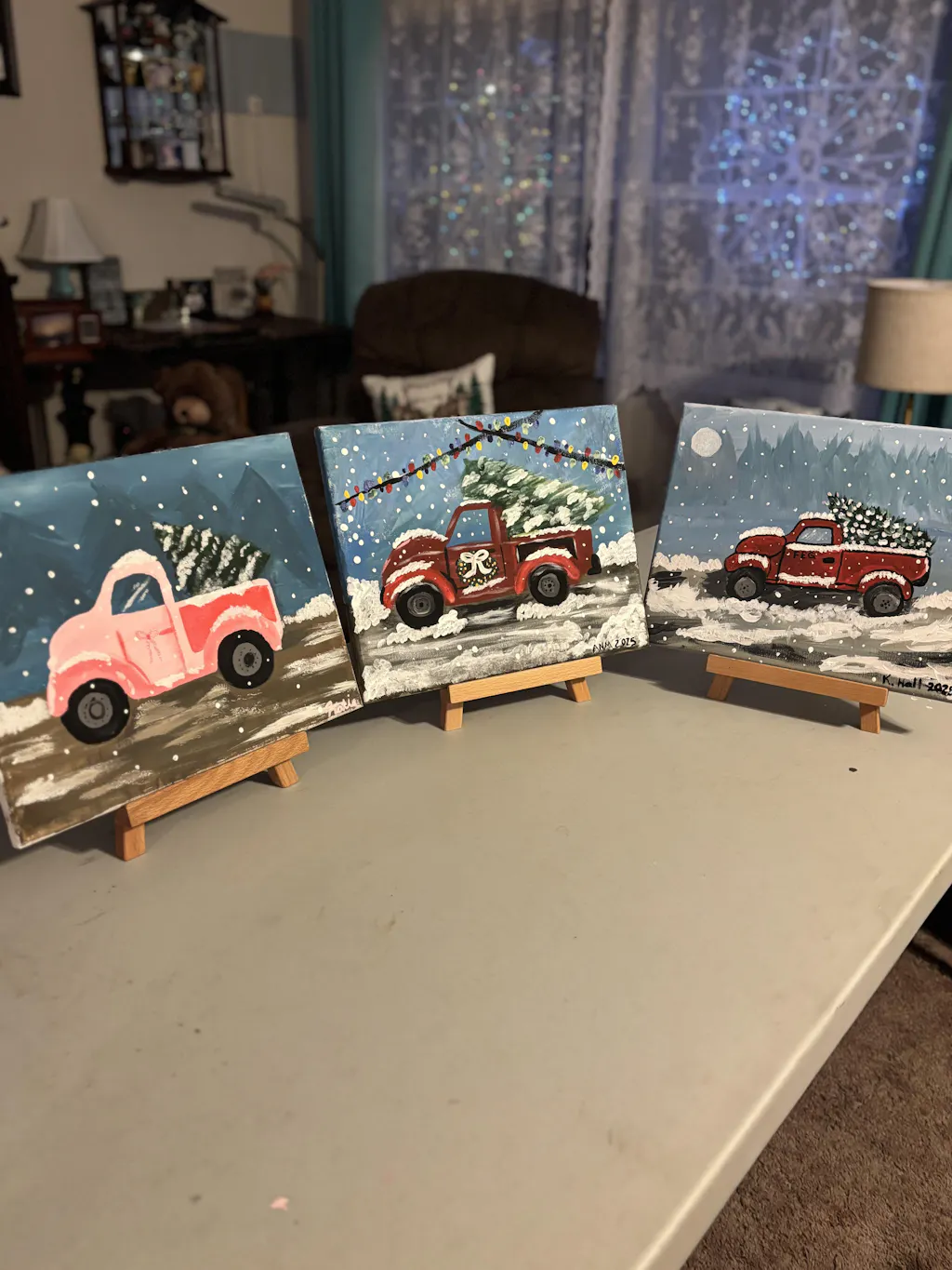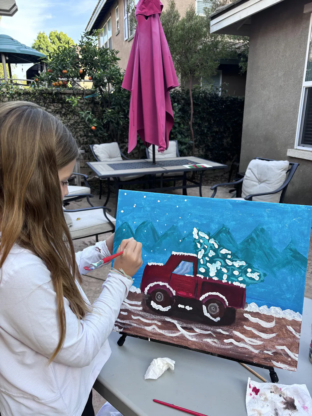 Is your favorite holiday tradition picking out a Christmas tree? Create a beautiful winter scene with an old red pickup truck carrying a Christmas tree through the snow. Fun for the whole family.