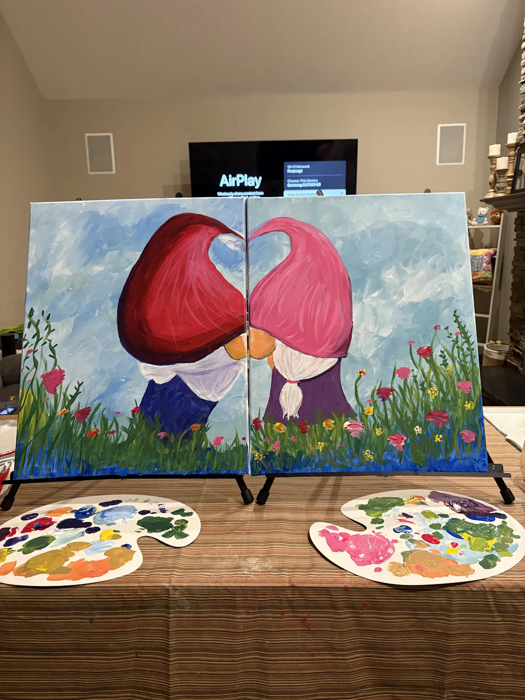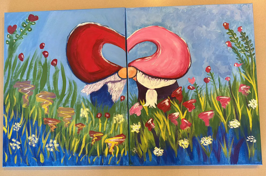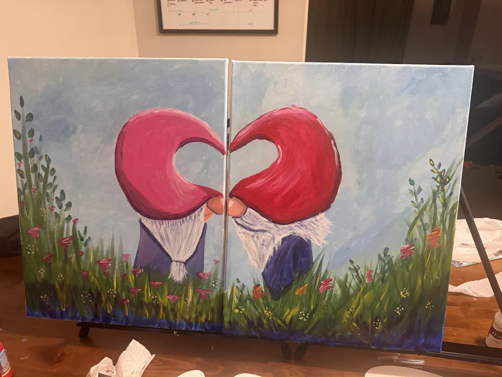 Talk about relationship goals! This happy pair of gnomes rub their noses together in the perfect picture of affection. Paint both gnomes together on one canvas for an adorable solo painting, or snuggle two canvases together and paint a matching set with your main squeeze!