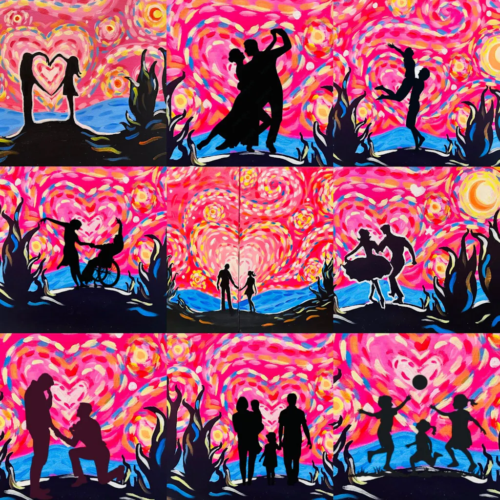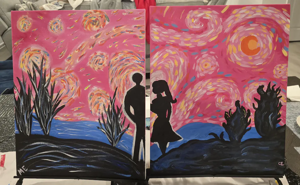 Dip your brush in romance and paint the sky with swirling stars! Grab your special someone and *Gogh* on a creative journey together as you create this painting inspired by Van Gogh’s world-famous “Starry Night.” Customize the figures in your painting for an extra special personal touch.