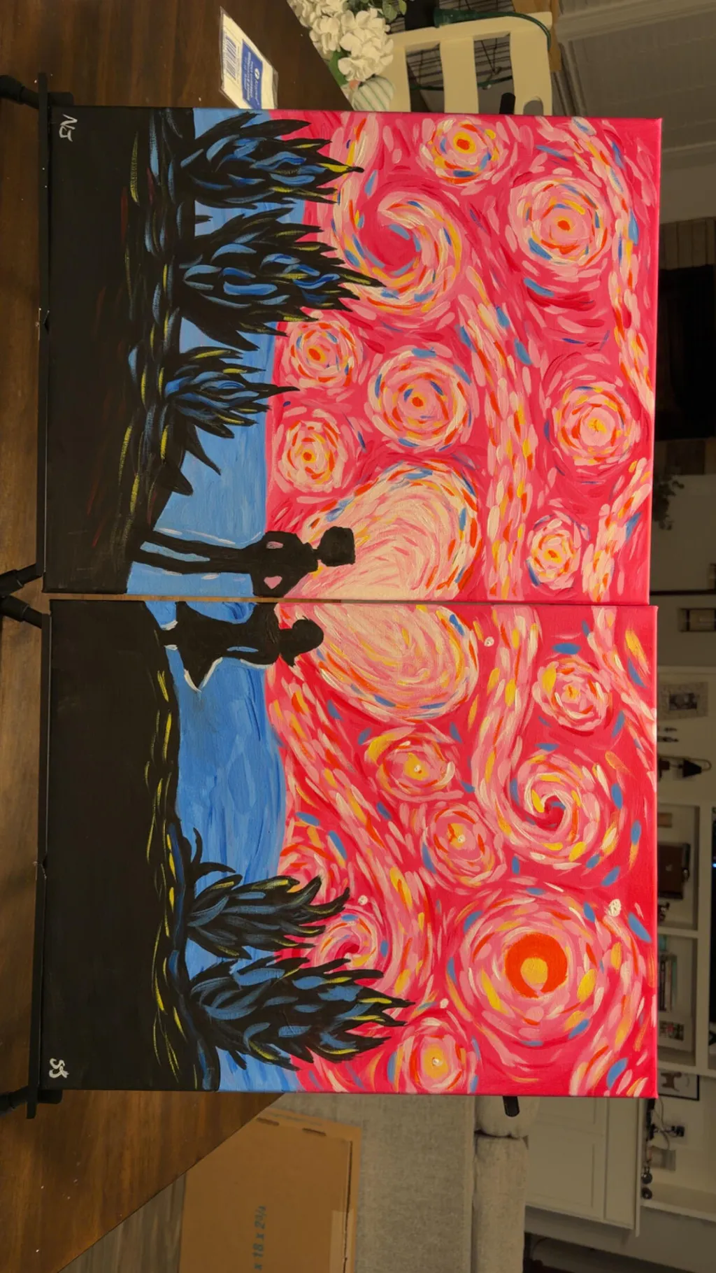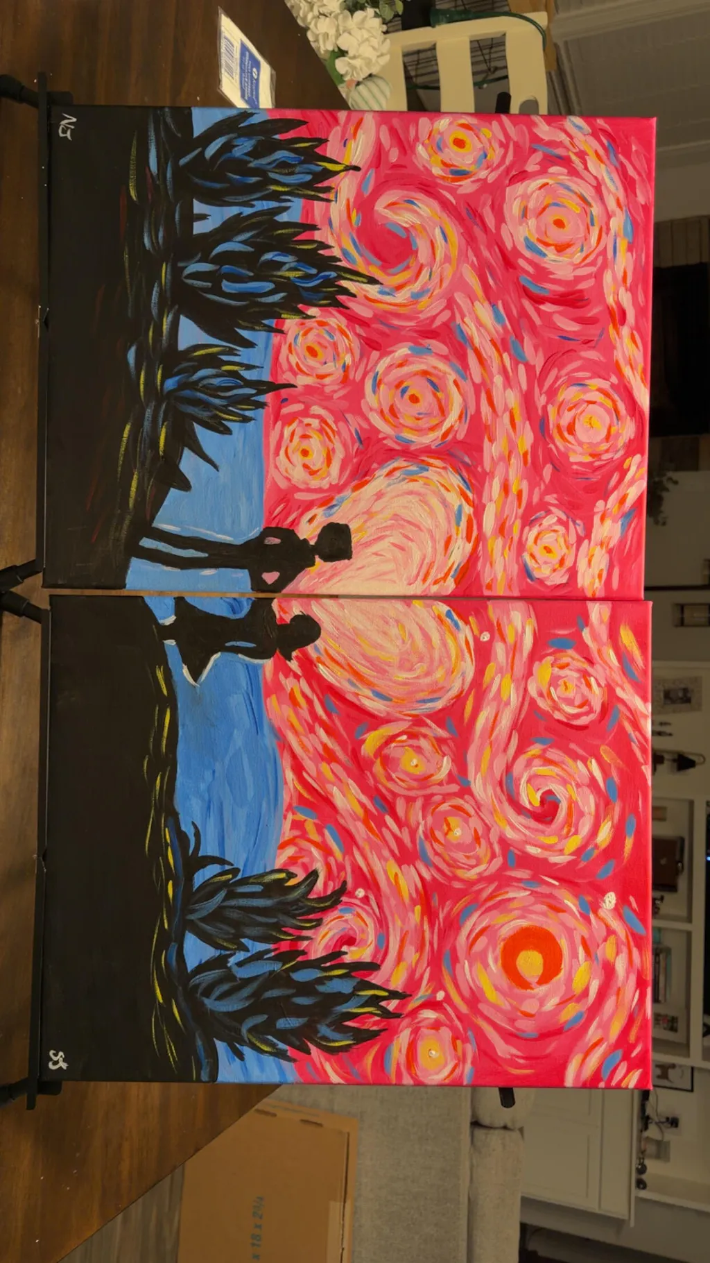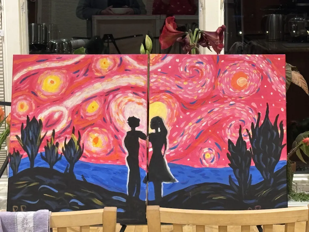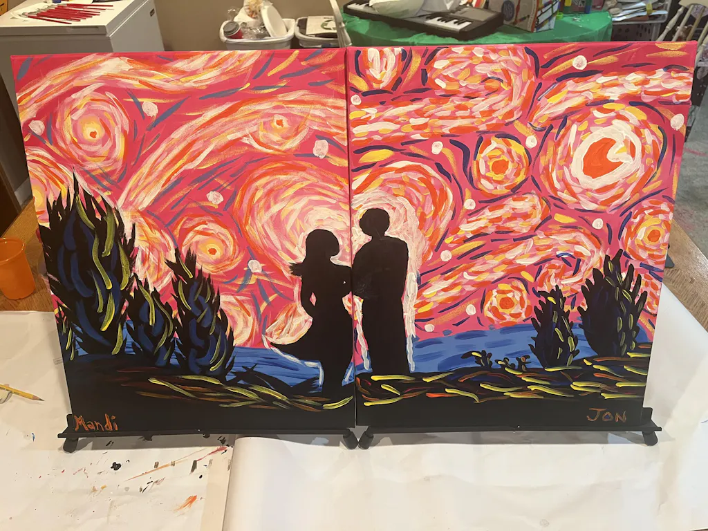 We recommend our Date Night Studio or our Date Night Essentials Kit For a date night diptych experience. You will paint one half of the painting on one canvas and your partner will paint the other half on another canvas. Each of you will have your own supplies.