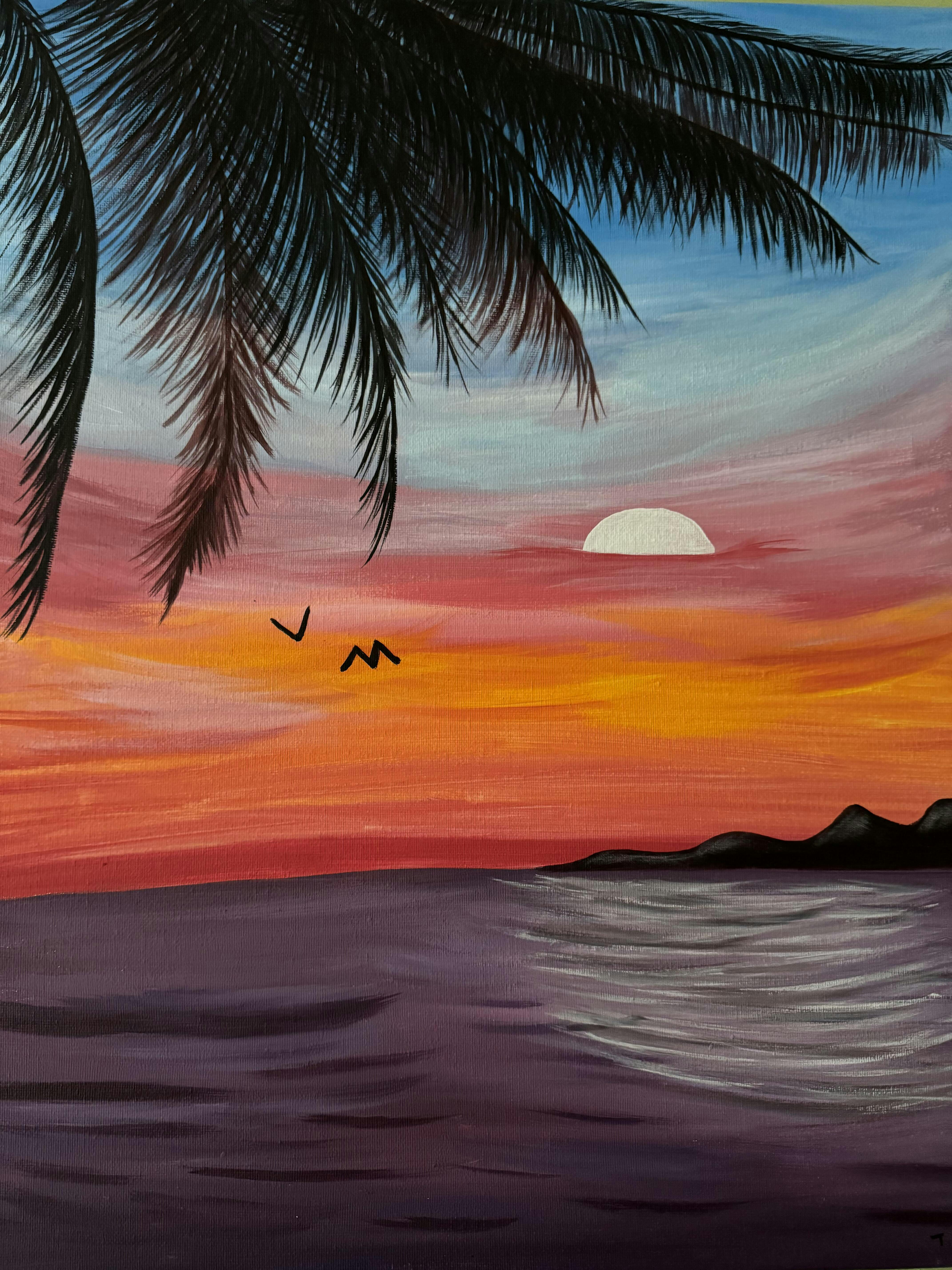 Paint your own window into paradise with this breezy tropical sunset. Learn how to blend colors for the perfect beachy sky, paint realistic reflections, and layer on the palm fronds to frame your masterpiece. Then sit back and soak up the perfect view!