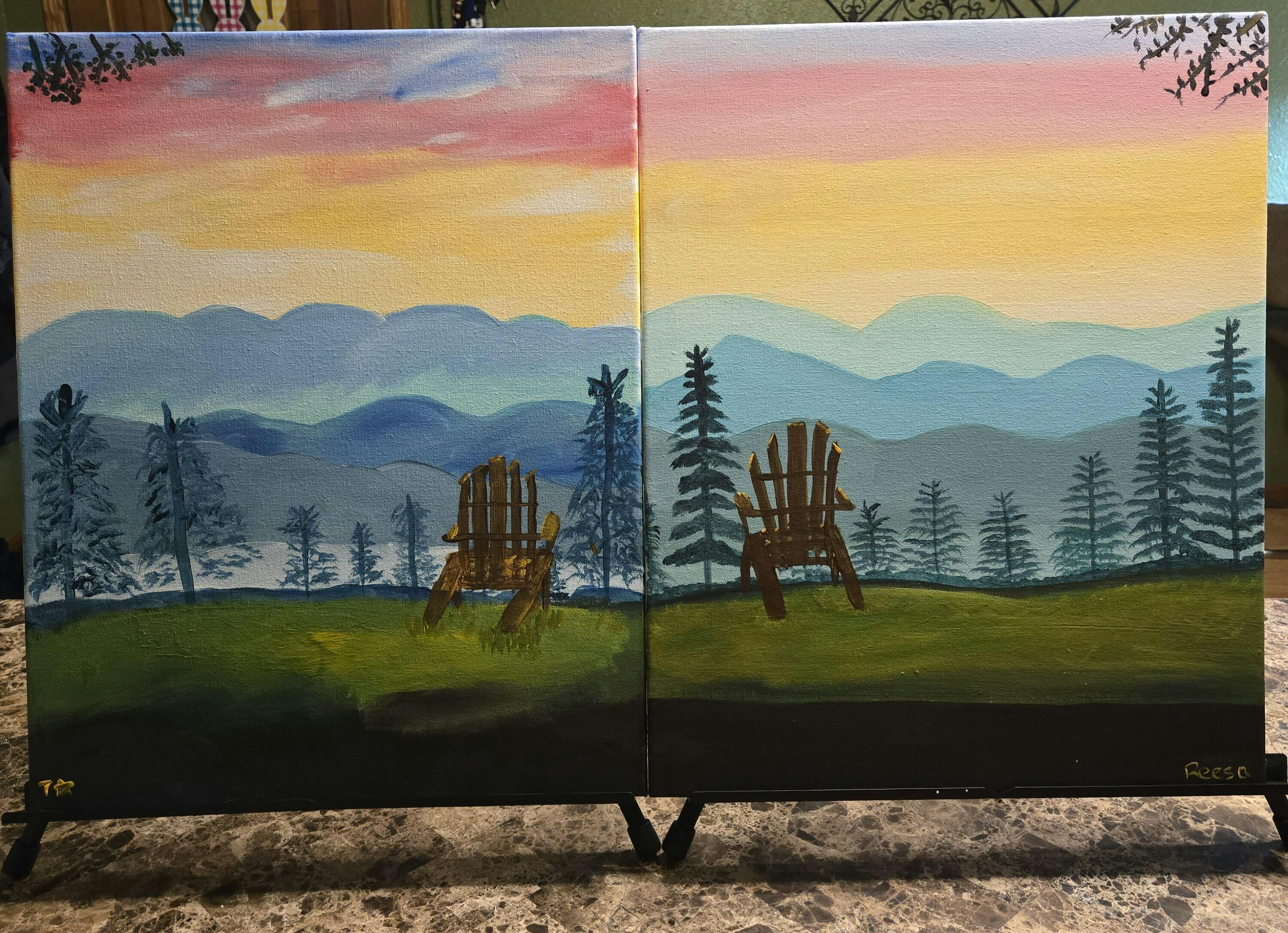 Pull up a chair, save a seat for your special someone, and enjoy this view of a breathtaking sunset blooming in the sky beyond the distant mountains. Combine both together onto one canvas for a scenic solo landscape painting, or scoot two canvases together to create a matching set that’s clearly meant to be side by side - just like the two of you!