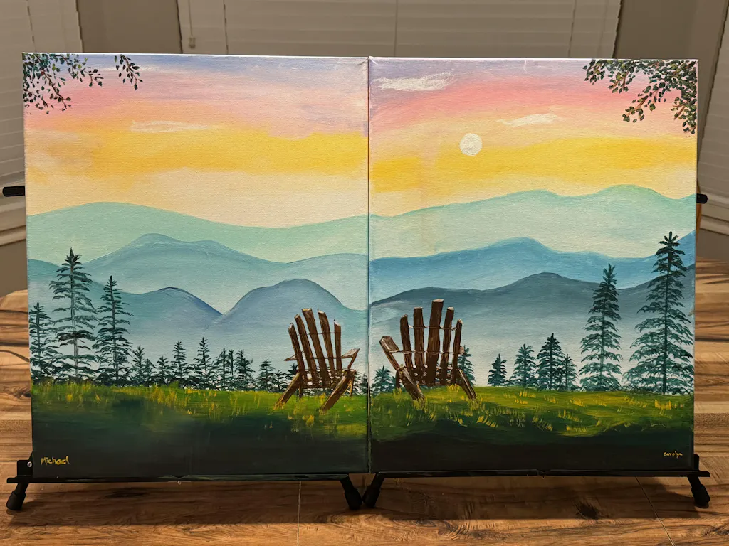 We recommend our Date Night Studio or our Date Night Essentials Kit For a date night diptych experience. You will paint one half of the painting on one canvas and your partner will paint the other half on another canvas. Each of you will have your own supplies.