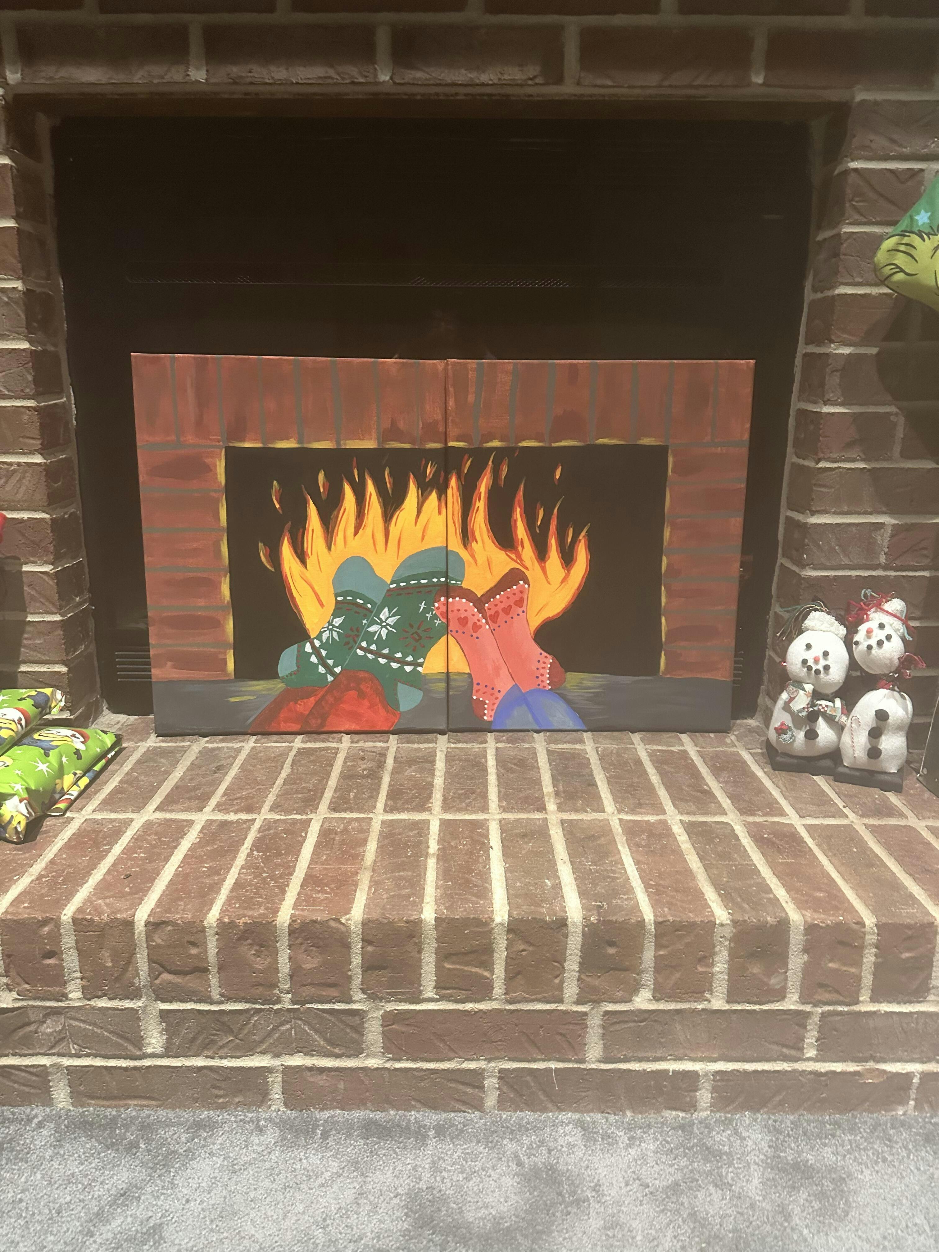 Cuddle up with your special someone to create this cozy masterpiece featuring comfy socks and a crackling fire in the fireplace! Combine both together onto one canvas for a sweet solo painting, or use two canvases to create a matching set that’s meant to be snuggled up together - just like the two of you!