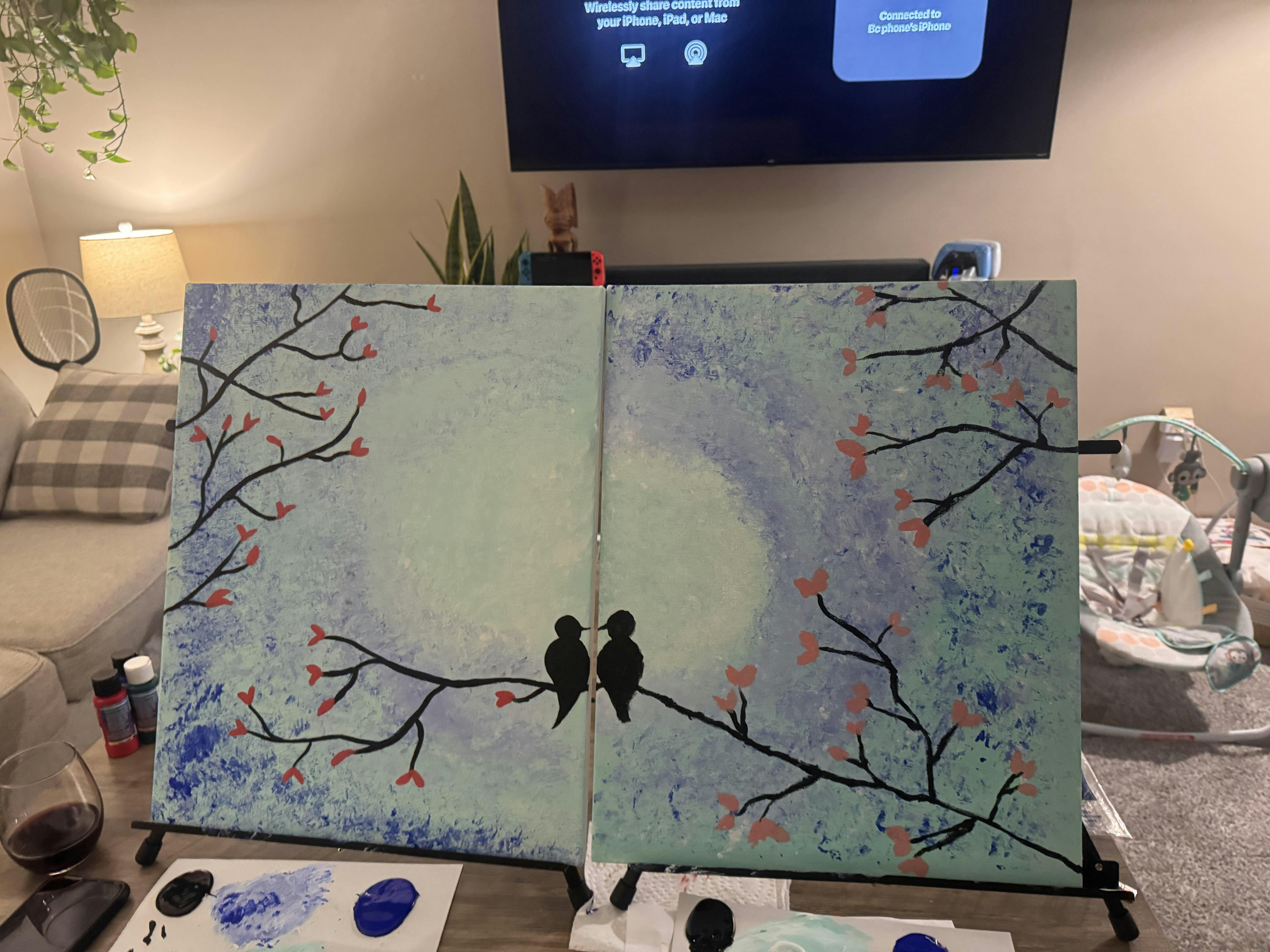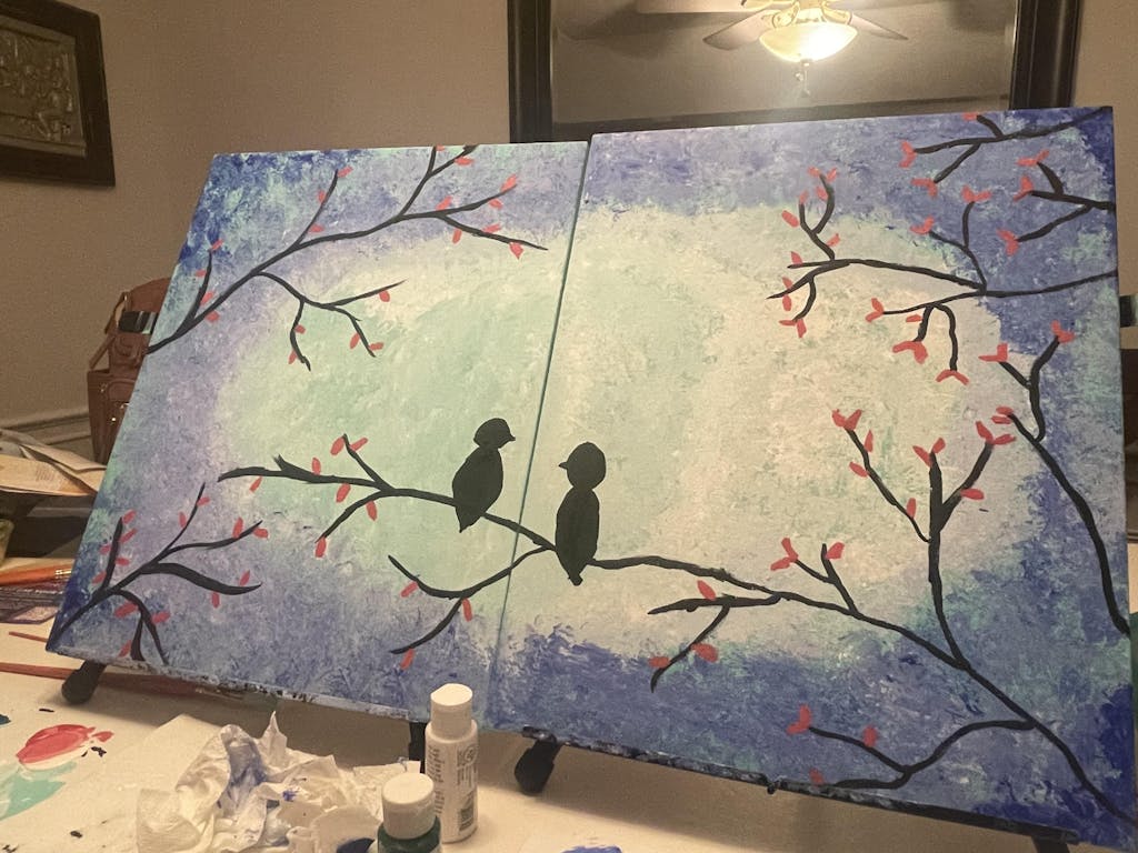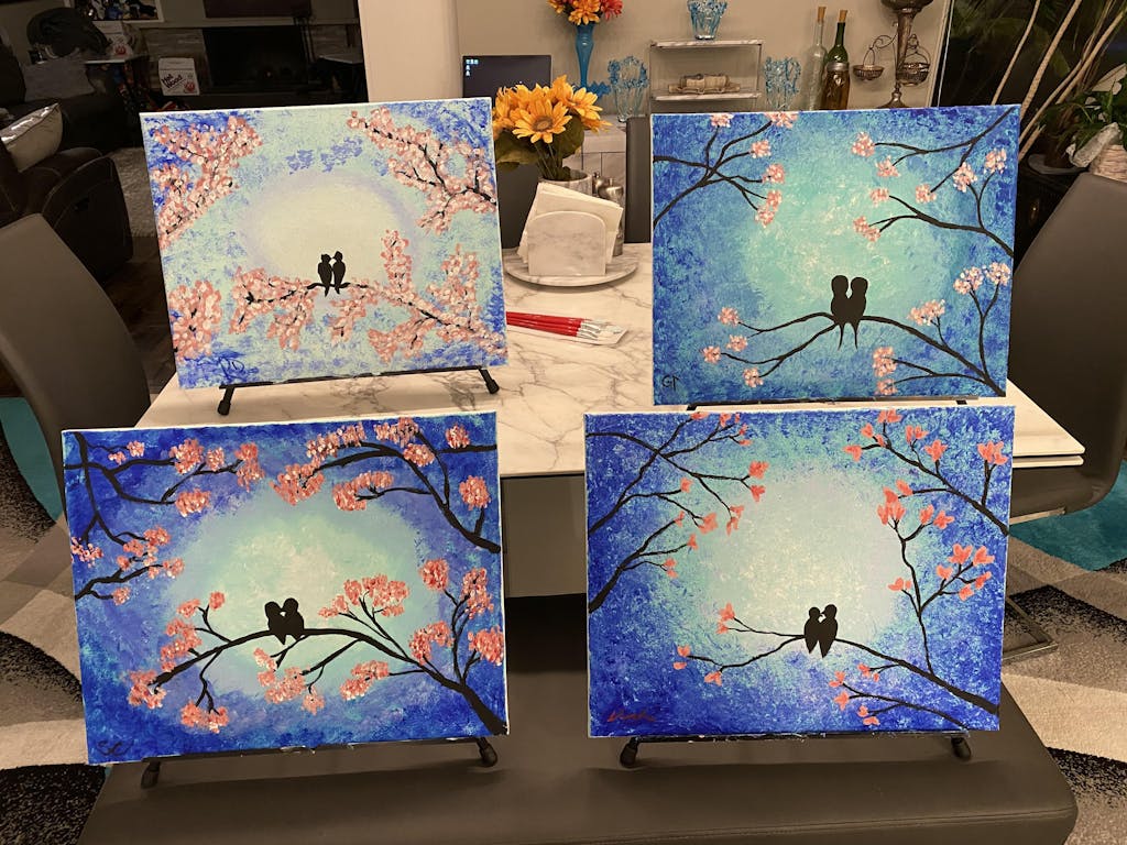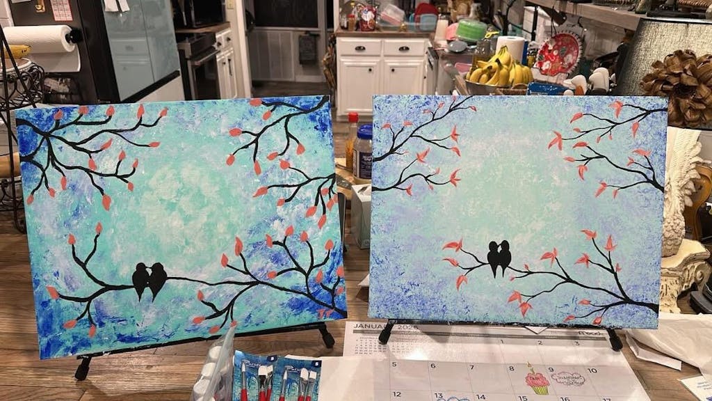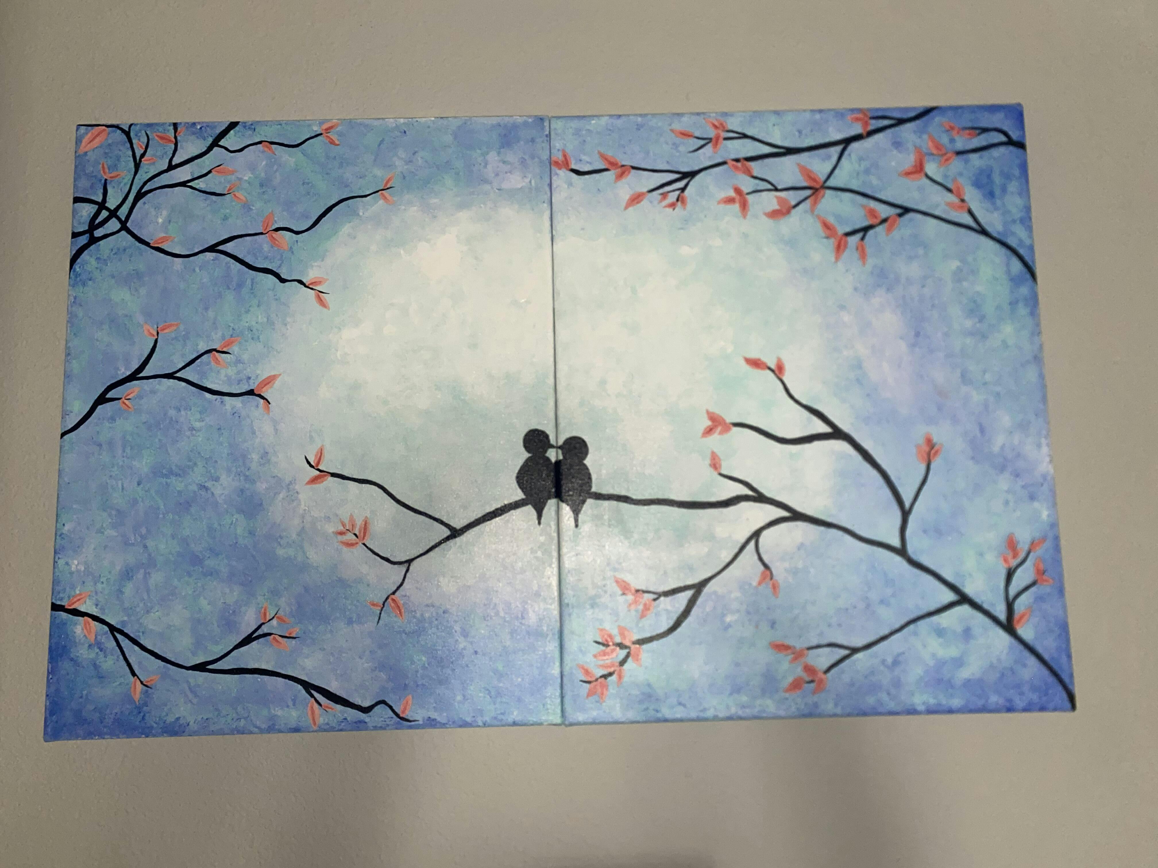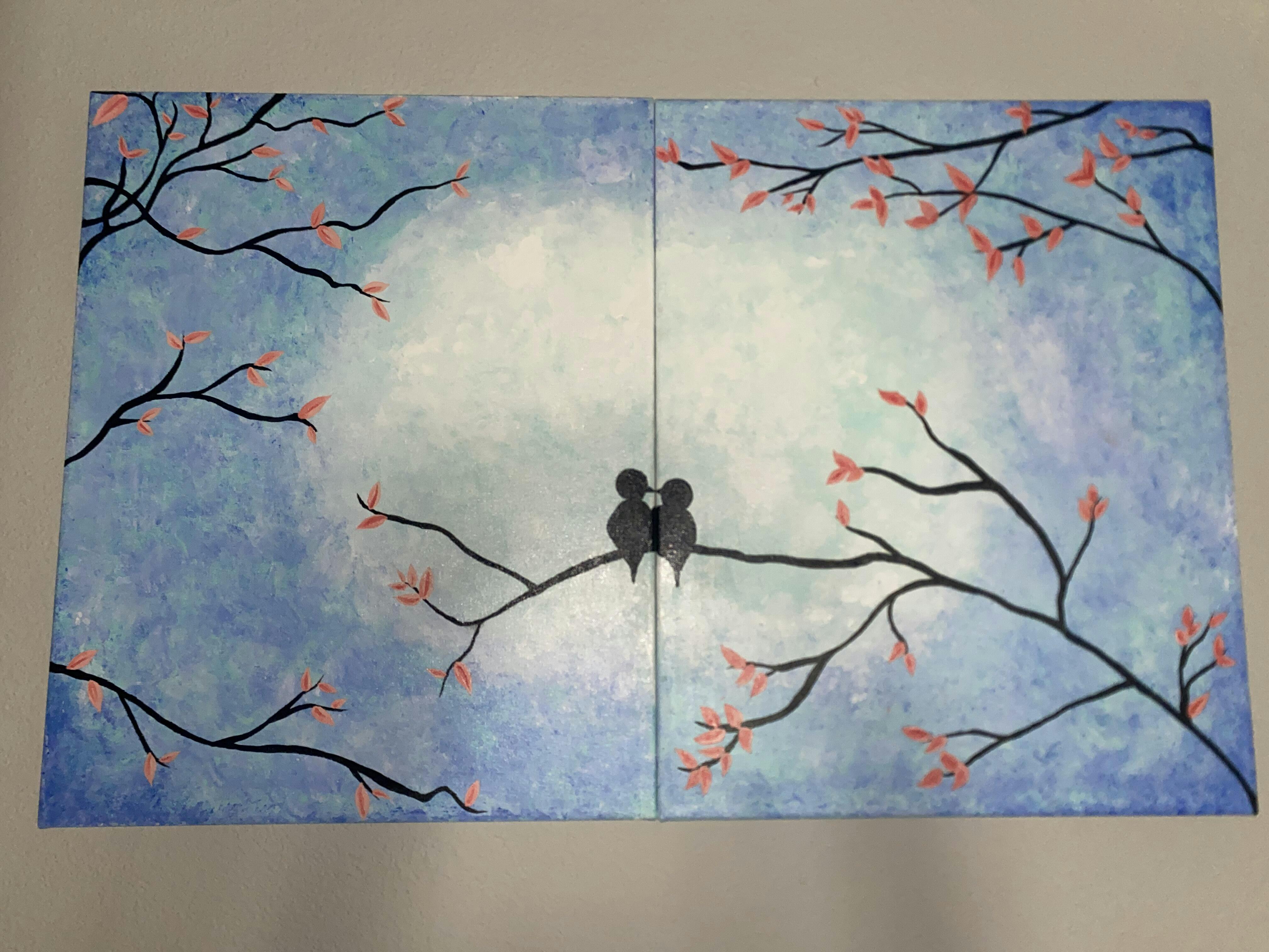 Can you feel the love between our cute little Lovebirds in this painting? Lovebirds at Dusk is a great painting for beginners as it incorporates simple strokes and a technique to create texture in your own painting! A great choice for date night - this painting can be completed on a single horizontal canvas or diptych style on two vertical canvases pushed together.