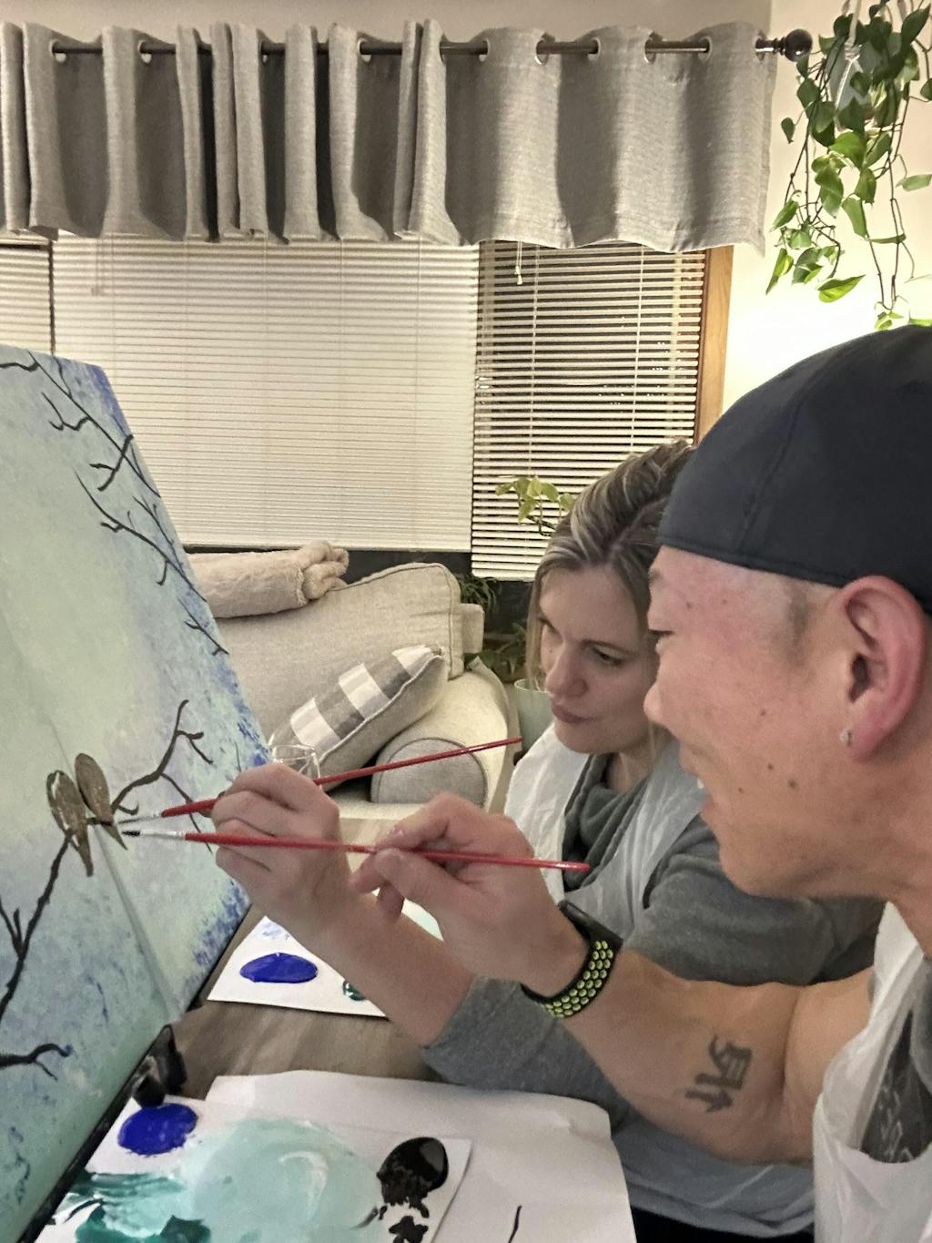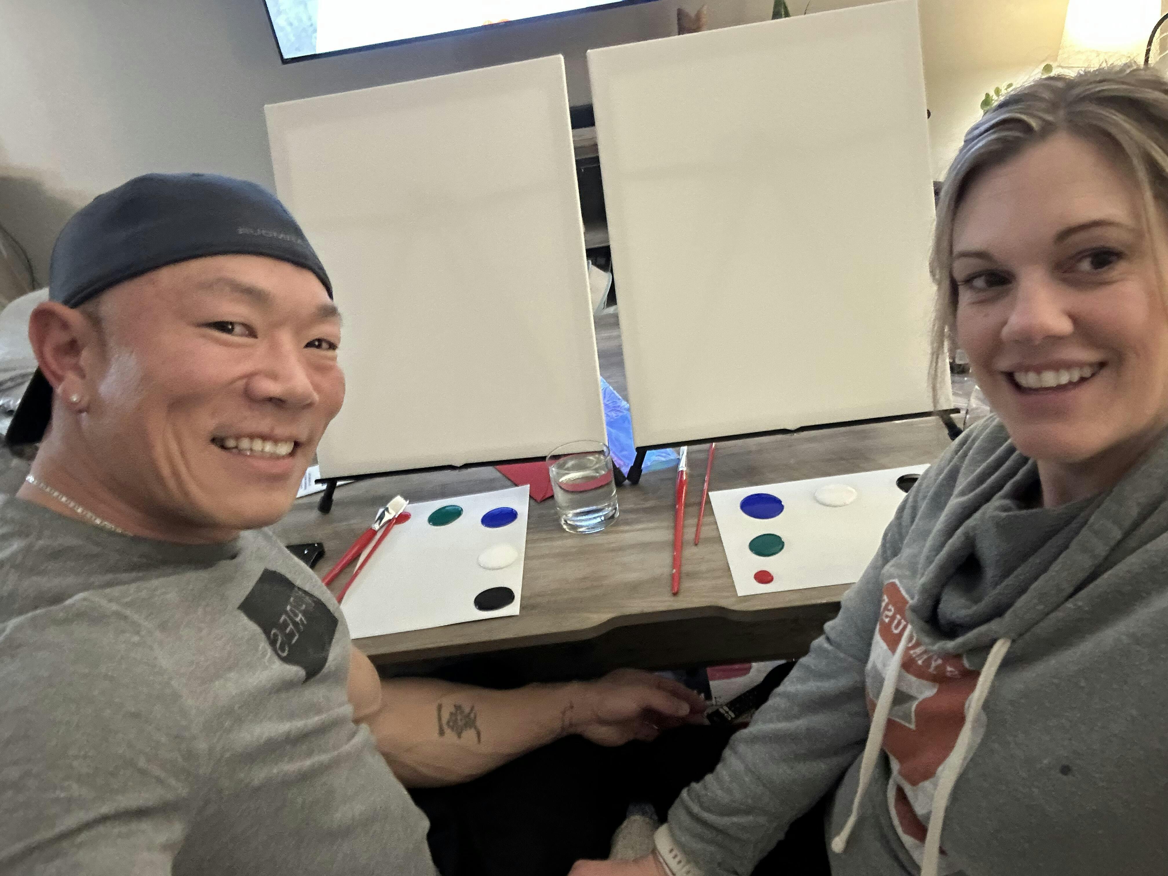 We recommend our Date Night Studio or our Date Night Essentials Kit For a date night diptych experience. You will paint one half of the painting on one canvas and your partner will paint the other half on another canvas. Each of you will have your own supplies.