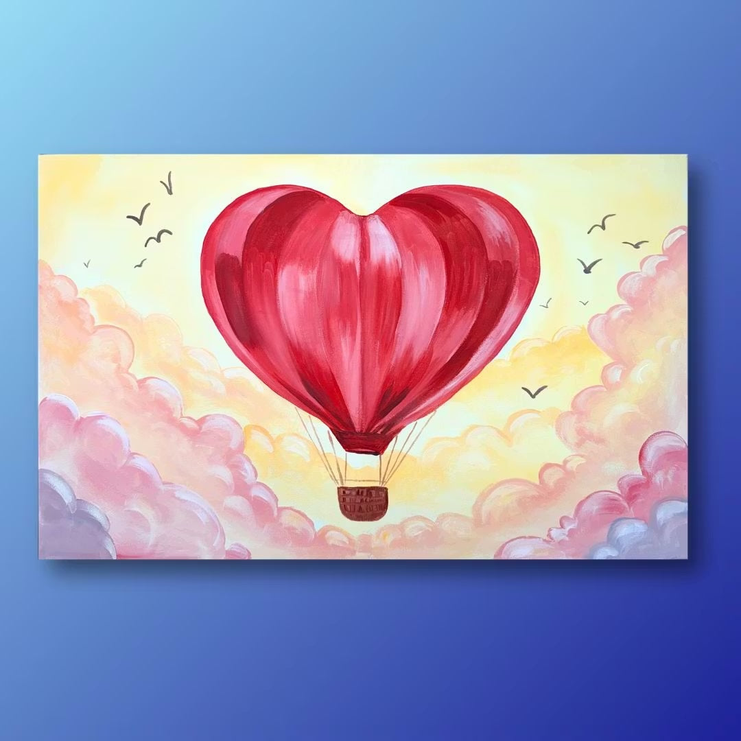 Love Takes Flight features a heart-shaped hot air balloon drifting through a soft, glowing sky. Warm light, gentle clouds, and distant birds create a scene that feels light, hopeful, and full of possibility.