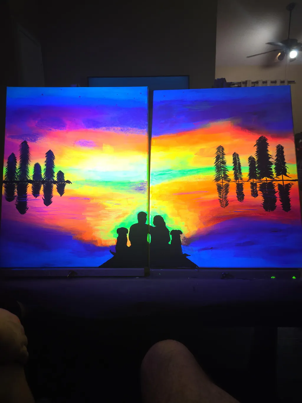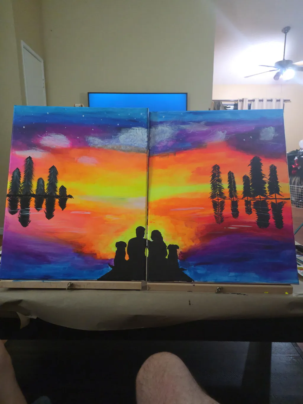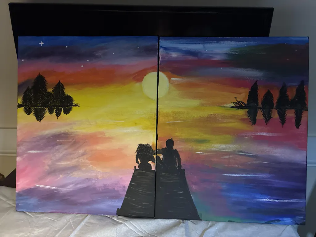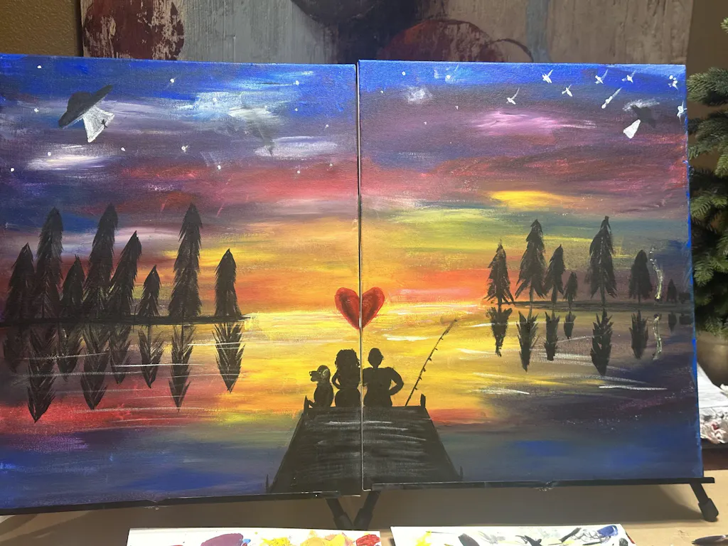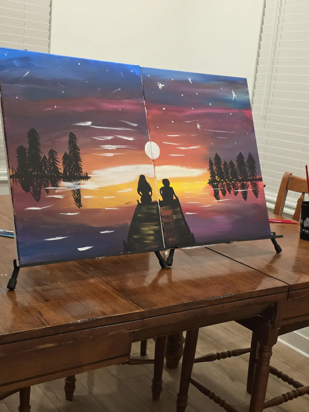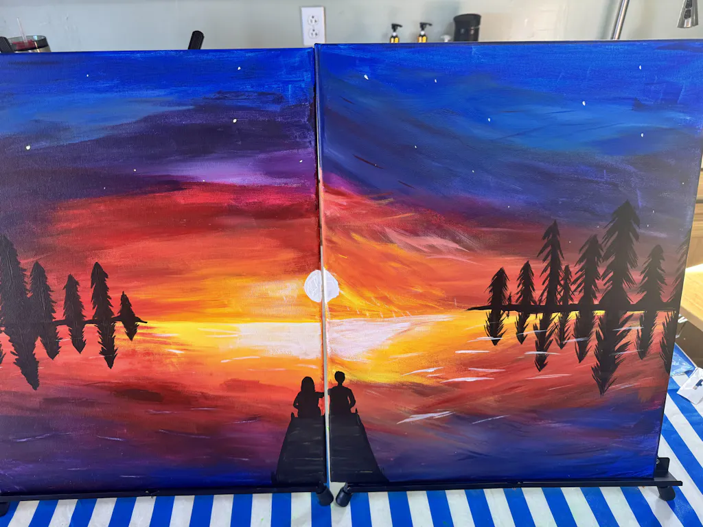 We recommend our Date Night Studio or our Date Night Essentials Kit For a date night diptych experience. You will paint one half of the painting on one canvas and your partner will paint the other half on another canvas. Each of you will have your own supplies.
