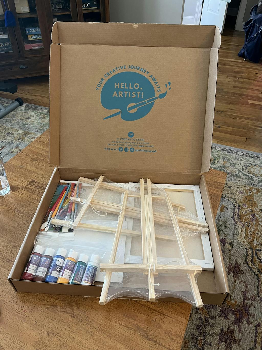 Each kit includes all the necessary art supplies and access to easy-to-follow video tutorial. You'll find paints, brushes, canvases, easel all the tools required to complete the painting.