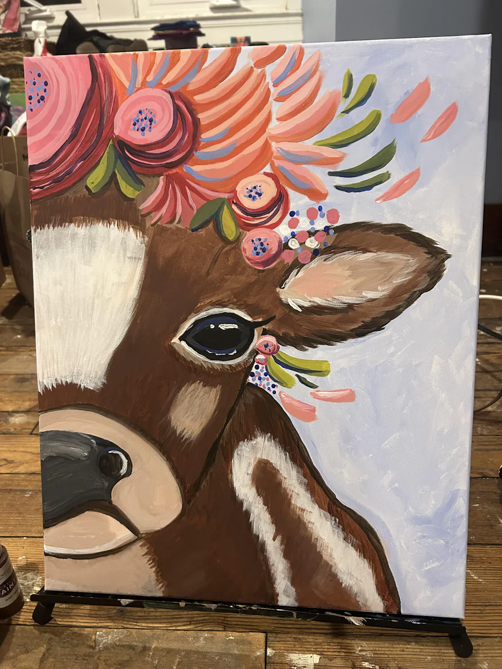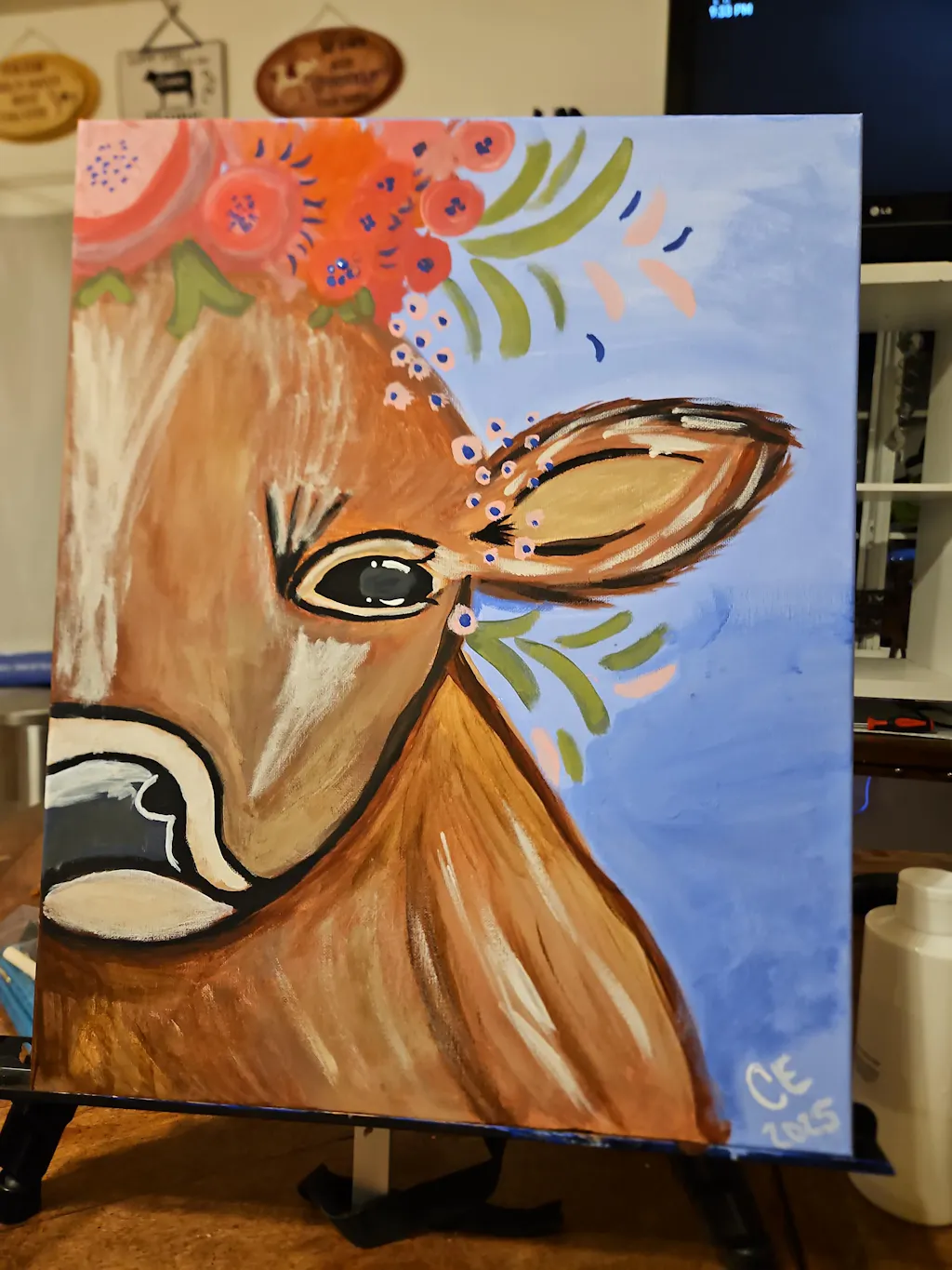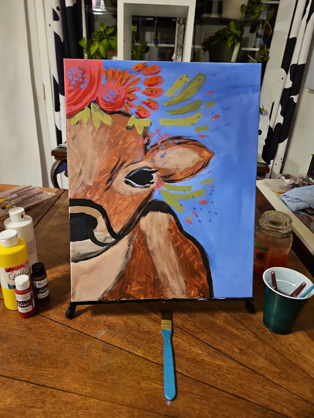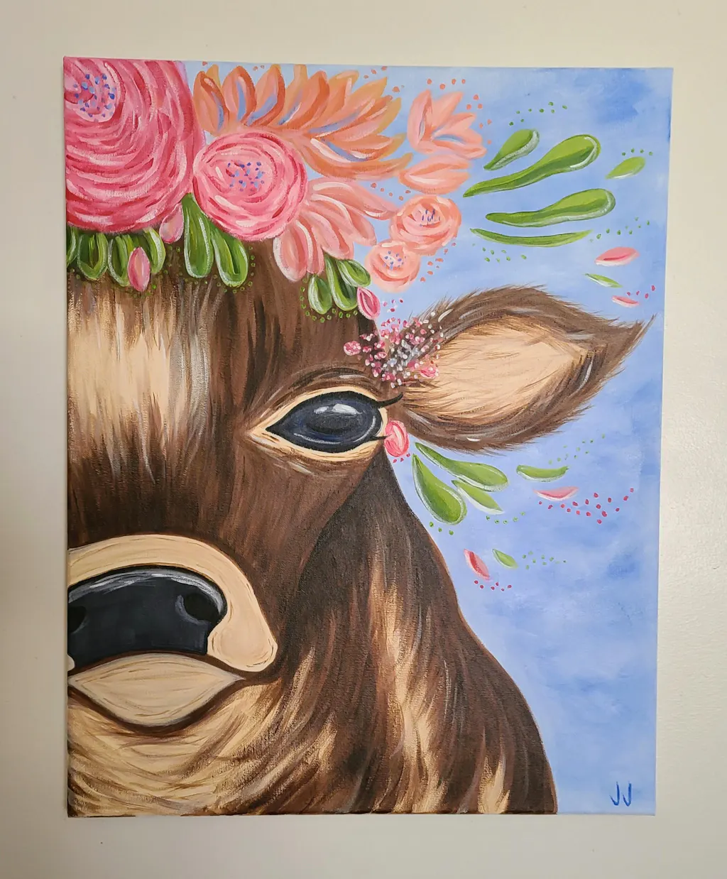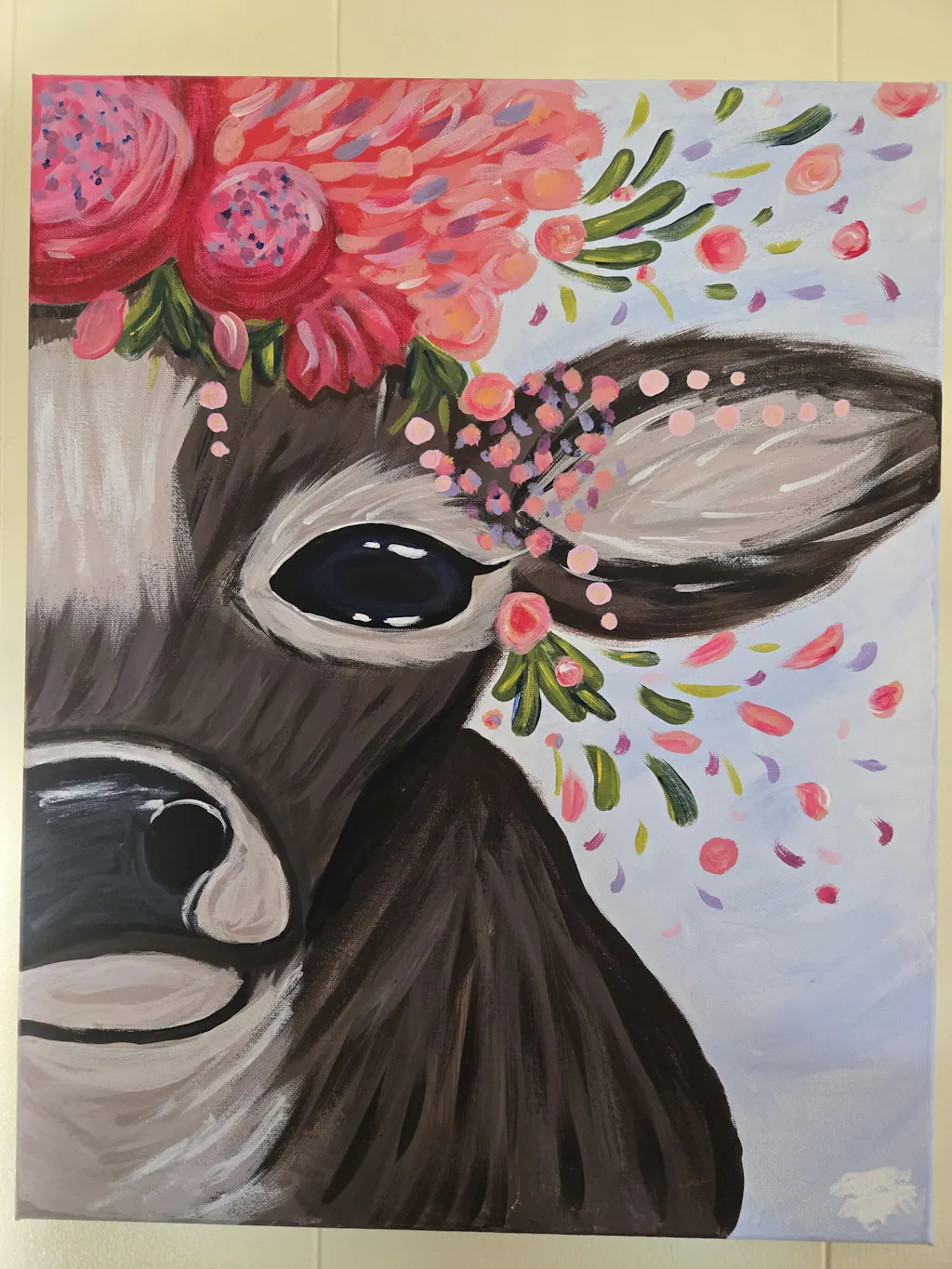 May we present: maven of the meadow, duchess of dairy, her royal highness - the Queen of the Pasture! Crowned with flowers, this bright-eyed bovine grazes blissfully at her leisure. A cleverly cropped composition means you won’t have to worry about achieving perfect symmetry, leaving you to attend to more enjoyable matters, like stopping to smell the flowers - just like the star of this painting!
