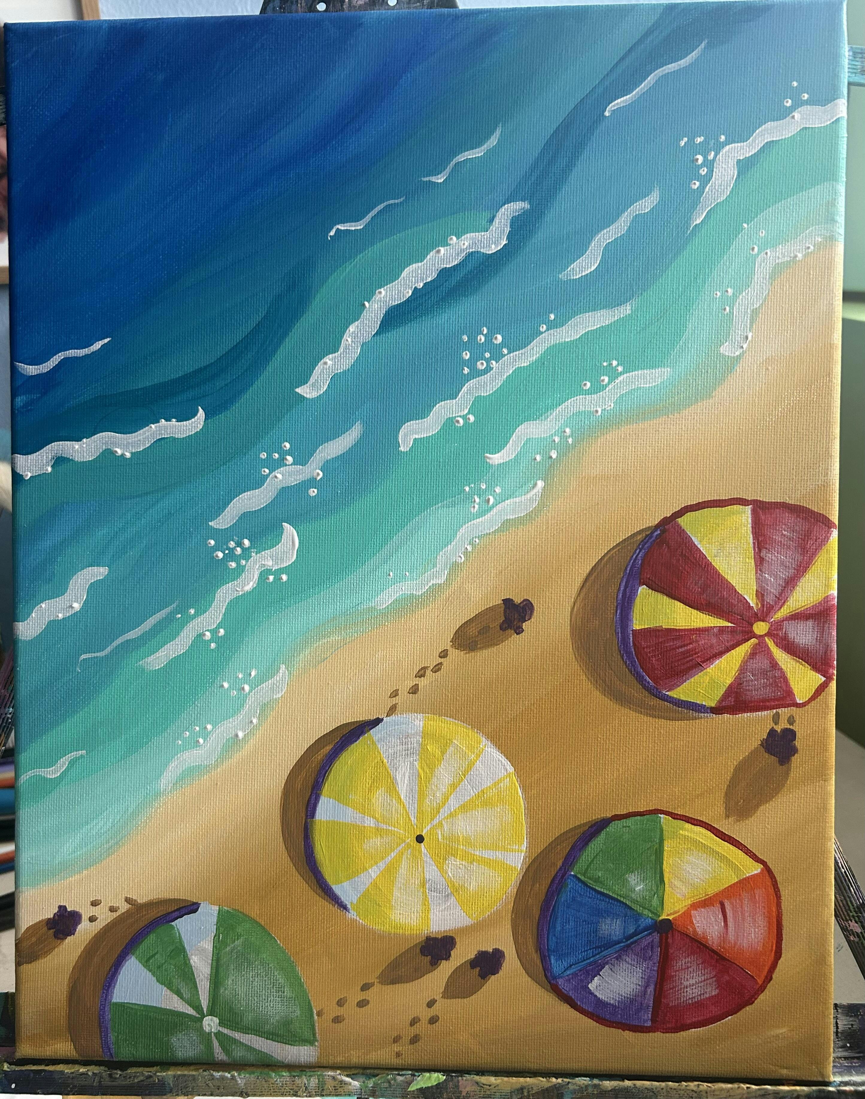 Dreaming of a seaside getaway? You can almost hear the waves gently lapping at the shore in this aerial view of an umbrella-dotted beach. Perfect for Summer paint parties.