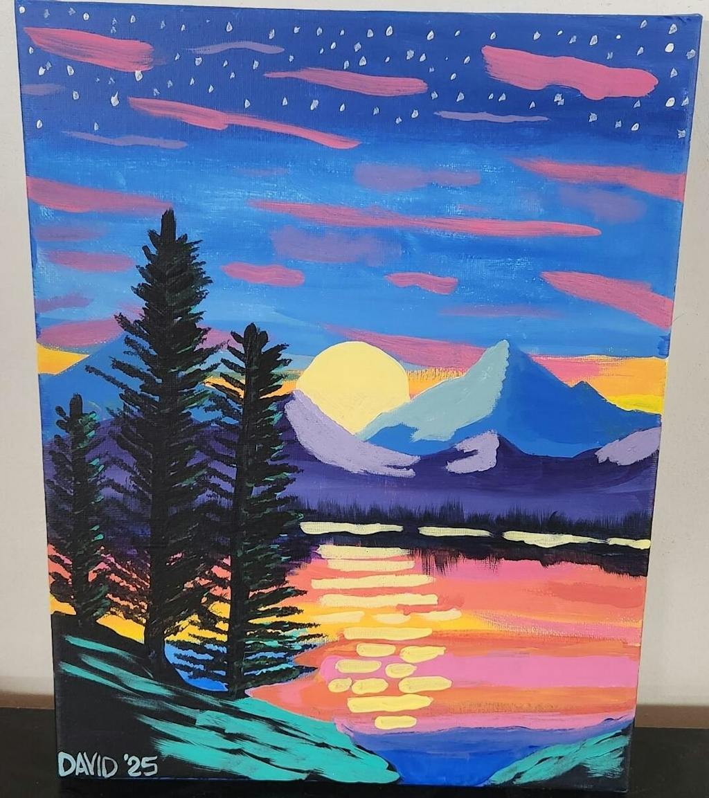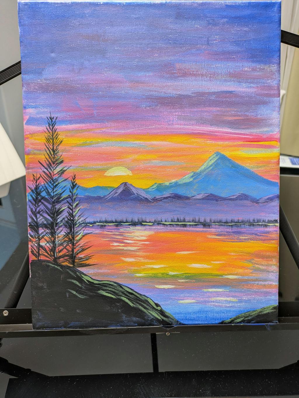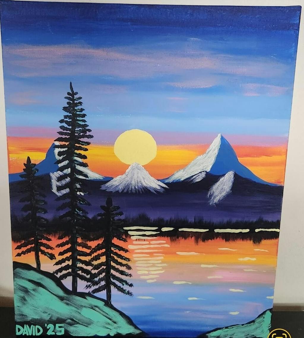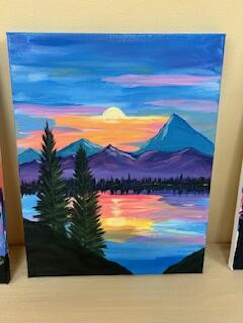 There are no mistakes, only happy little accidents in this lovely landscape featuring mighty mountains awash in a blaze of color! Learn how to layer bright colors to create a brilliant sunset sky, carve a majestic skyline, and add a cheerful trio of happy trees - just like television’s favorite artist!