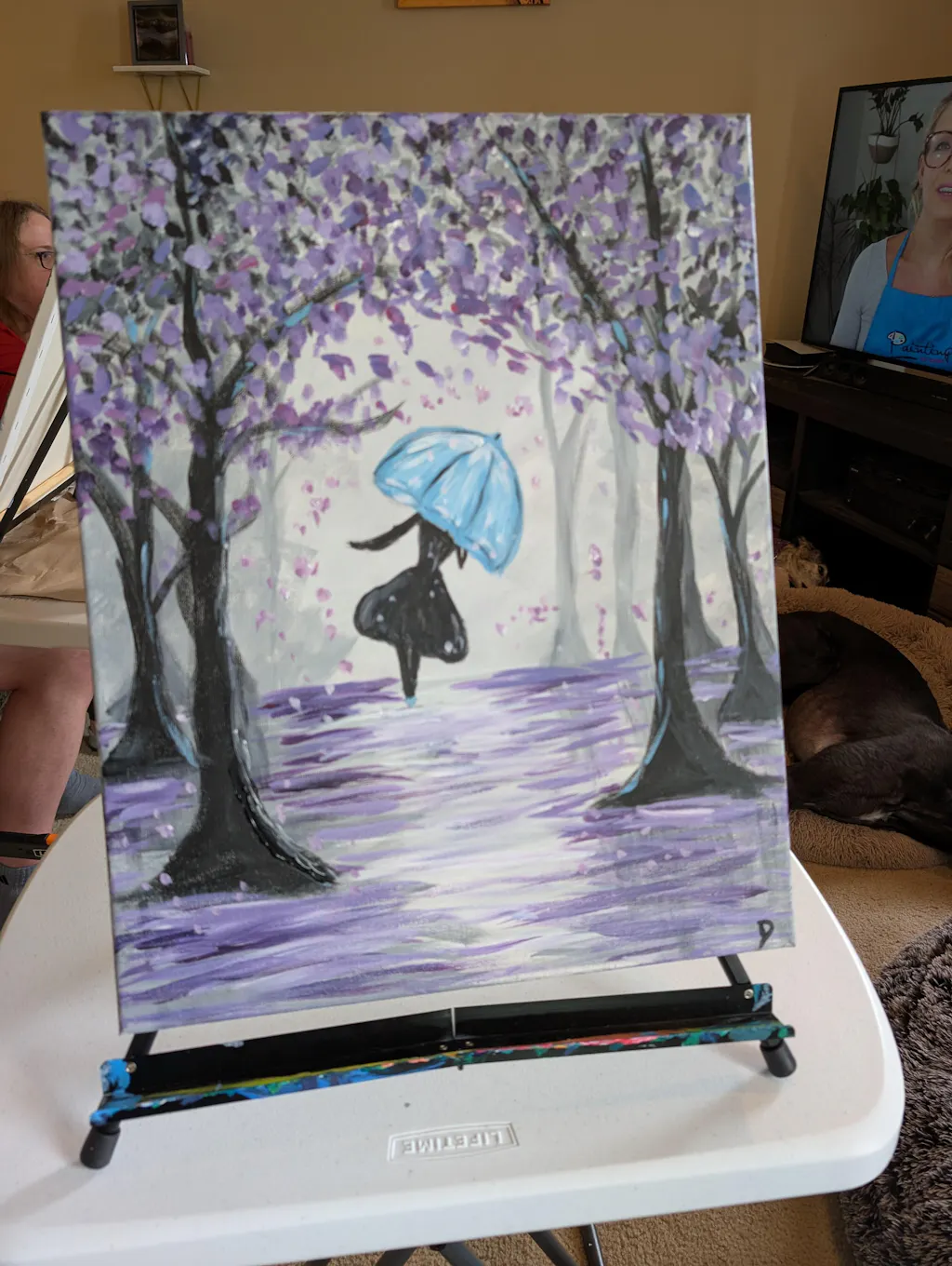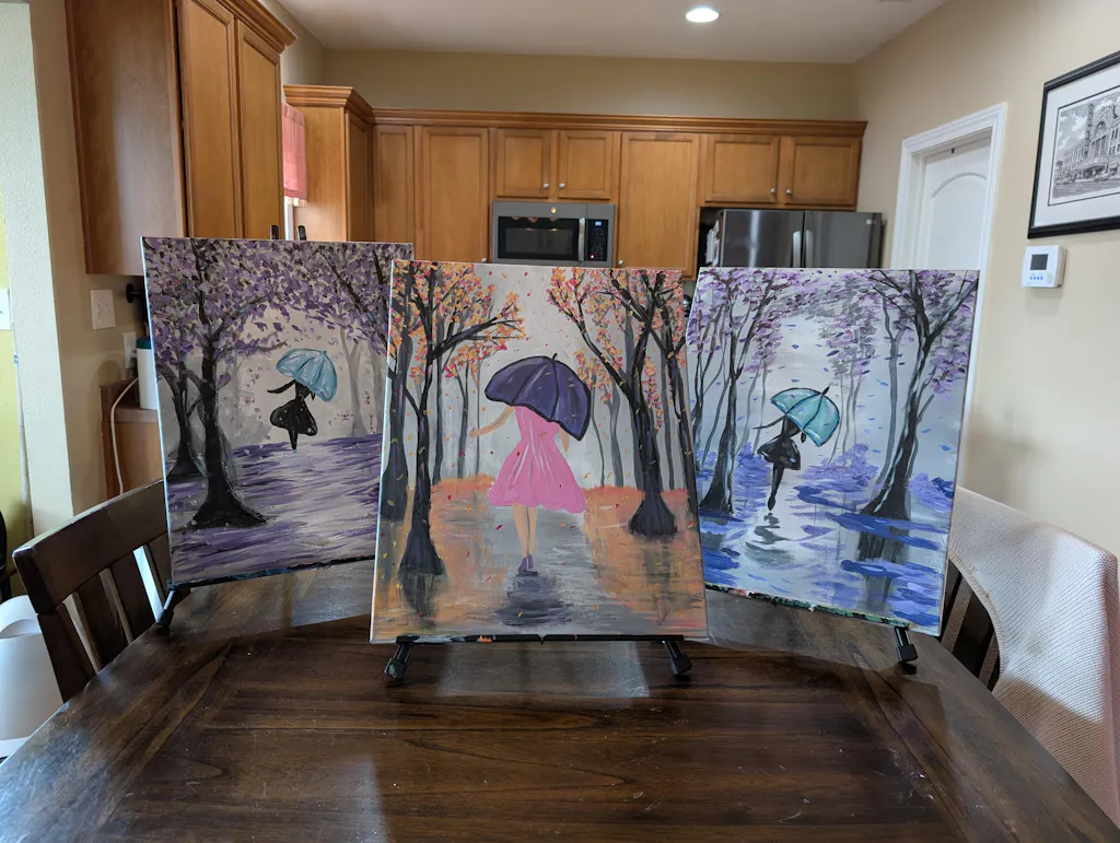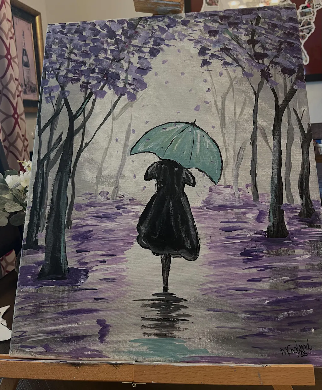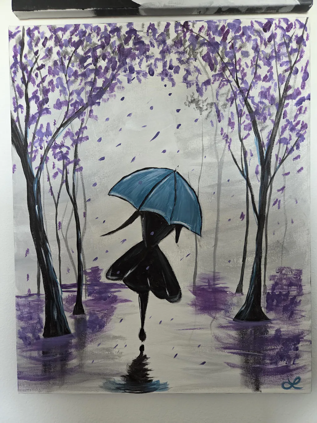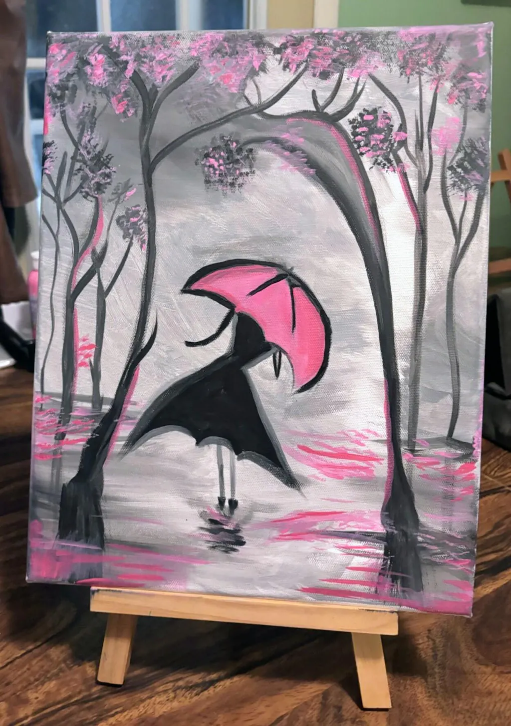 Don't let rainy days give you the blues! This painting makes the perfect reminder to walk with confidence no matter the weather. A monochromatic background makes the colorful umbrella and leaves pop. Customize your masterpiece with the colors that make you feel sunny!