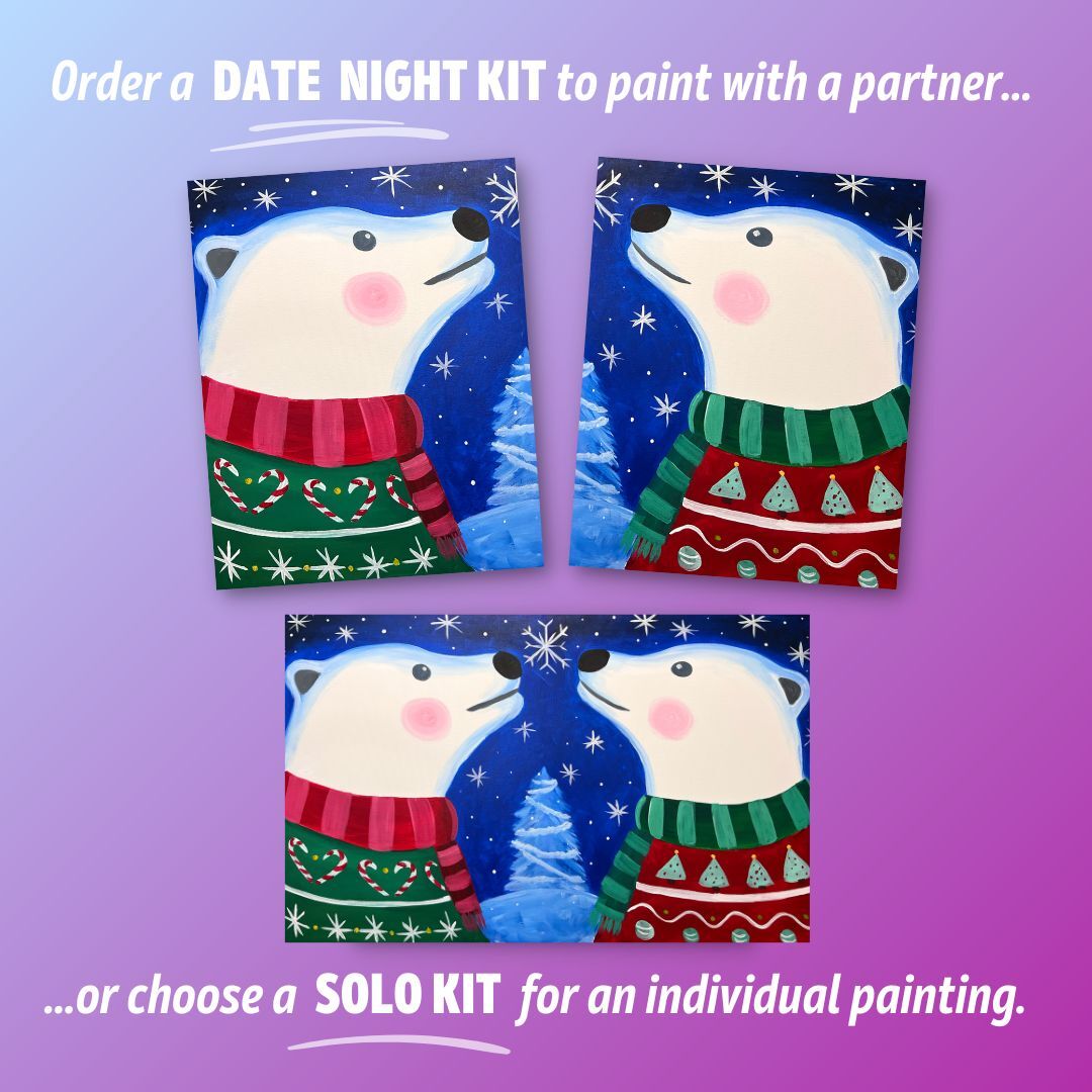 We recommend our Date Night Studio or our Date Night Essentials Kit For a date night diptych experience. You will paint one half of the painting on one canvas and your partner will paint the other half on another canvas. Each of you will have your own supplies.