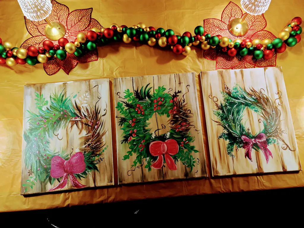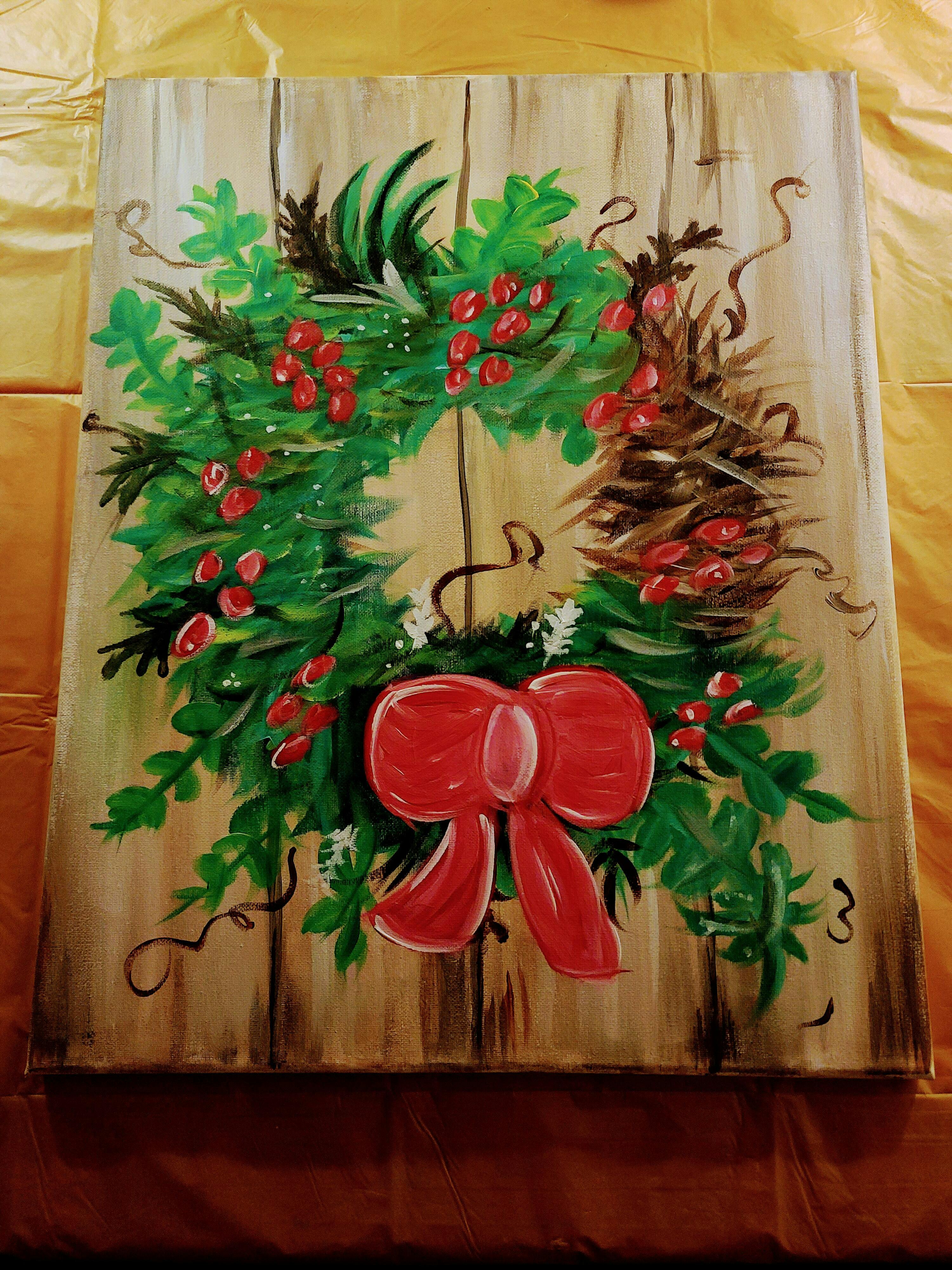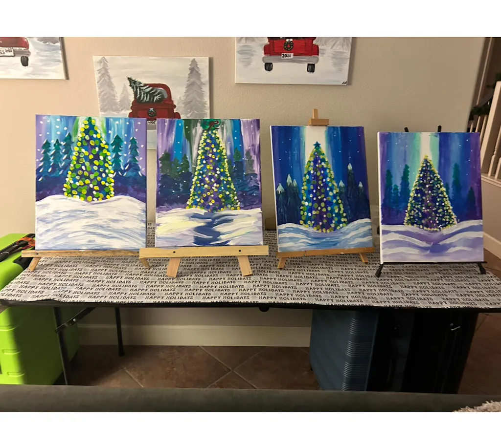The perfect painting collection for Christmas decor. Create four fabulously masterpieces with this joyful parade of paintings: a pick-up truck headed home from tree farm, a festive wreath to ring in the season, a stately evergreen festooned in glowing lights, and St. Nick himself making his way across the moonlight sky on Christmas Eve!