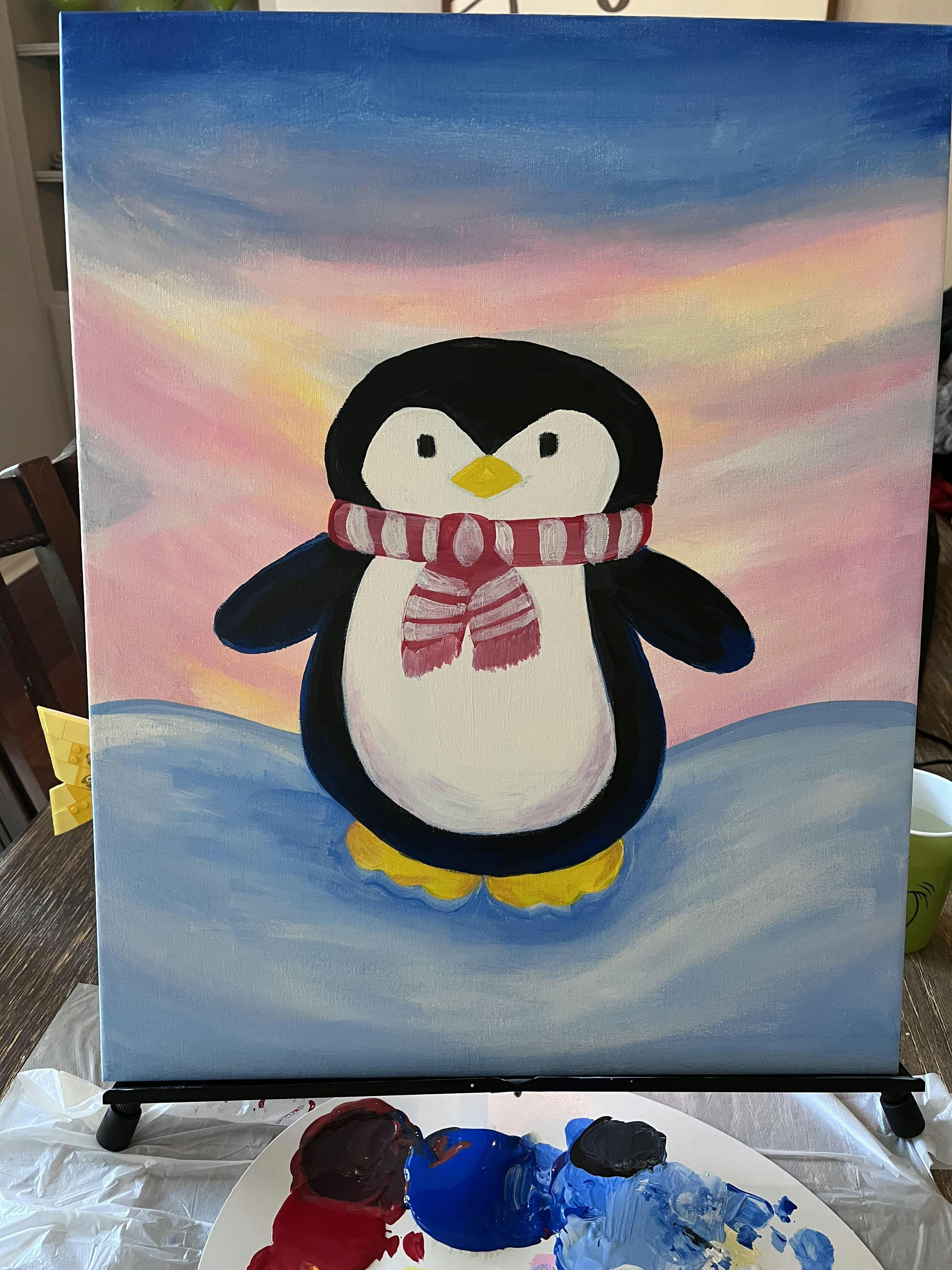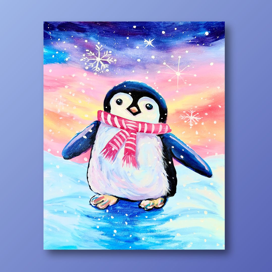 Join this charming penguin as it waddles through a snowy wonderland in Waddling Through Winter. With each brushstroke, you’ll capture the soft glow of the icy landscape and the peaceful spirit of the season. This painting is a joyful way to celebrate winter’s beauty — perfect for cozy solo sessions or creative paint parties alike.
