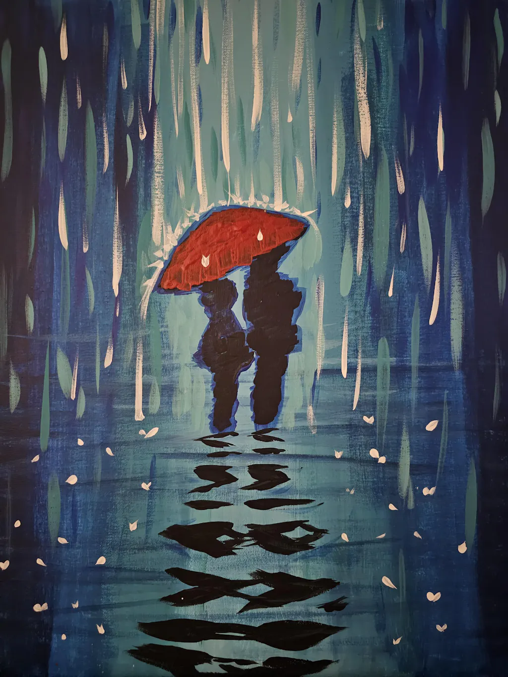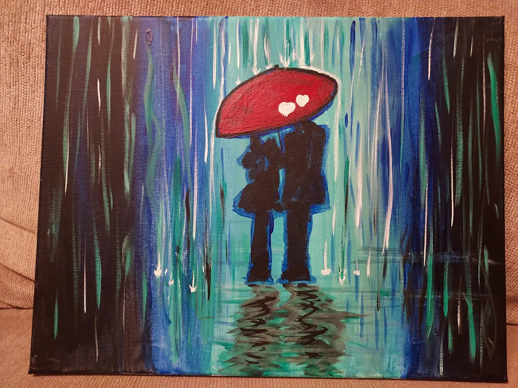 Create this romantic painting of a couple taking a walk in the rain down a slick city street. As long as they’ve got each other - well, and their big, red umbrella - not even the wettest day can dampen their spirits.