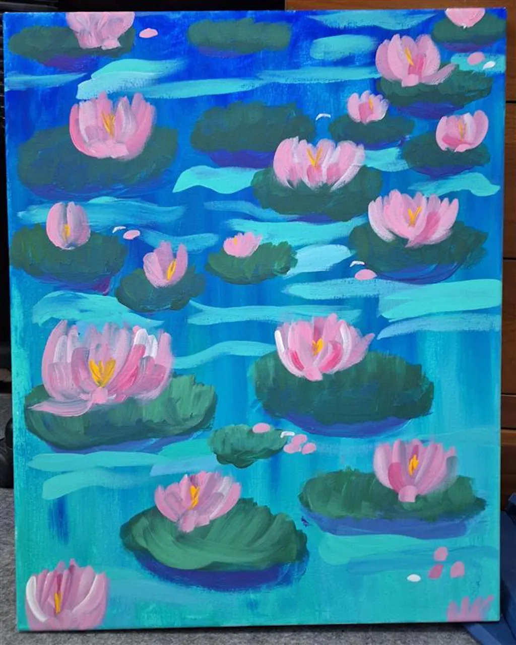 Our stylish spin on a classic! Using loose, chunky brushstrokes in luminous, vibrant colors, this beginner-friendly tribute to Monet’s iconic Water Lilies makes for an easygoing painting experience and a winner for your wall.