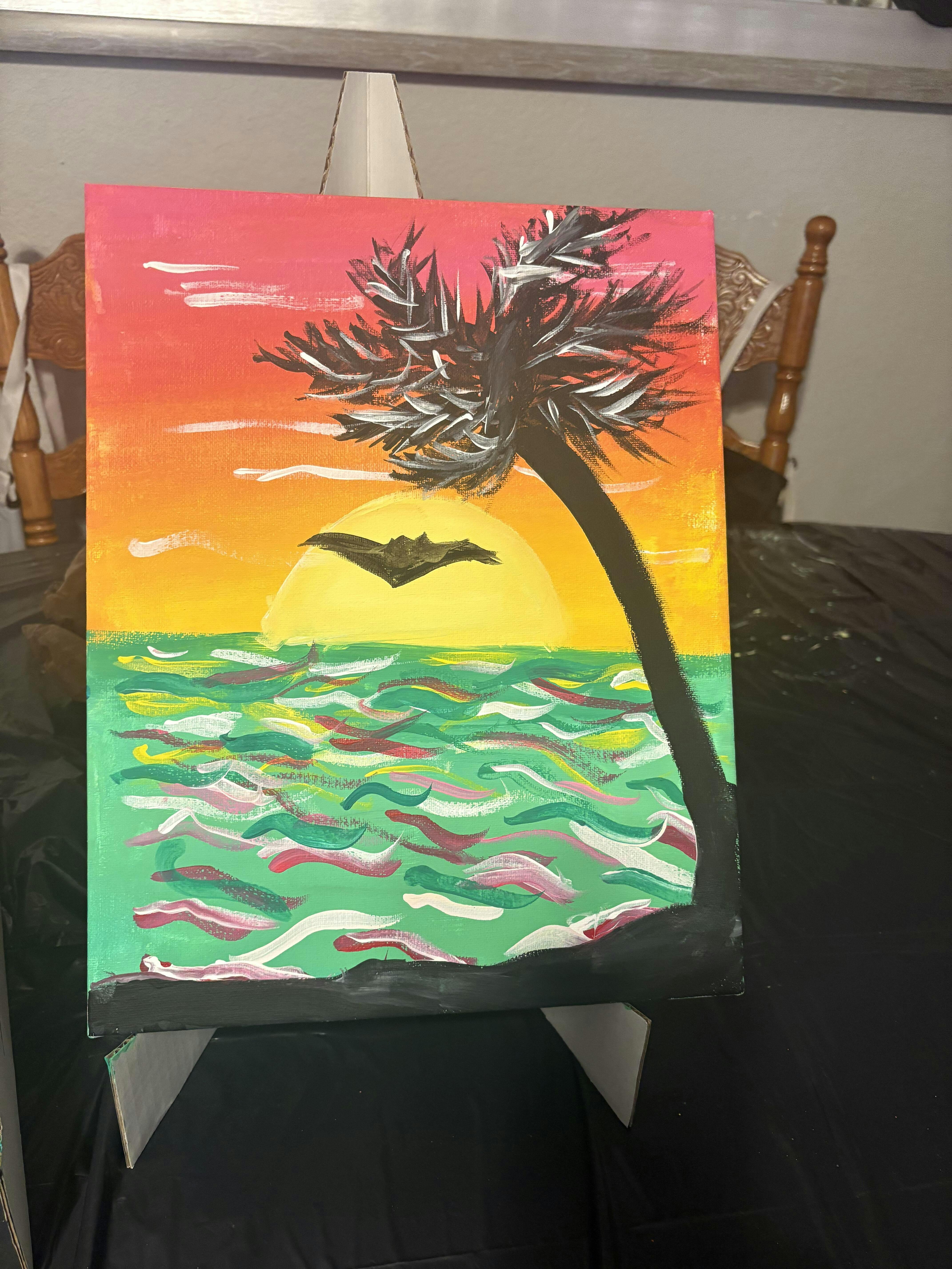Do you hear the horizon calling? This painting is for you! Adventure awaits as you set sail from this tropical island paradise across the sparkling sea. On this creative journey, you’ll learn how to blend colors for a vibrant sunset sky, add realistic reflections to water, and build the silhouette of a palm tree swaying in the breeze one brush stroke at a time.