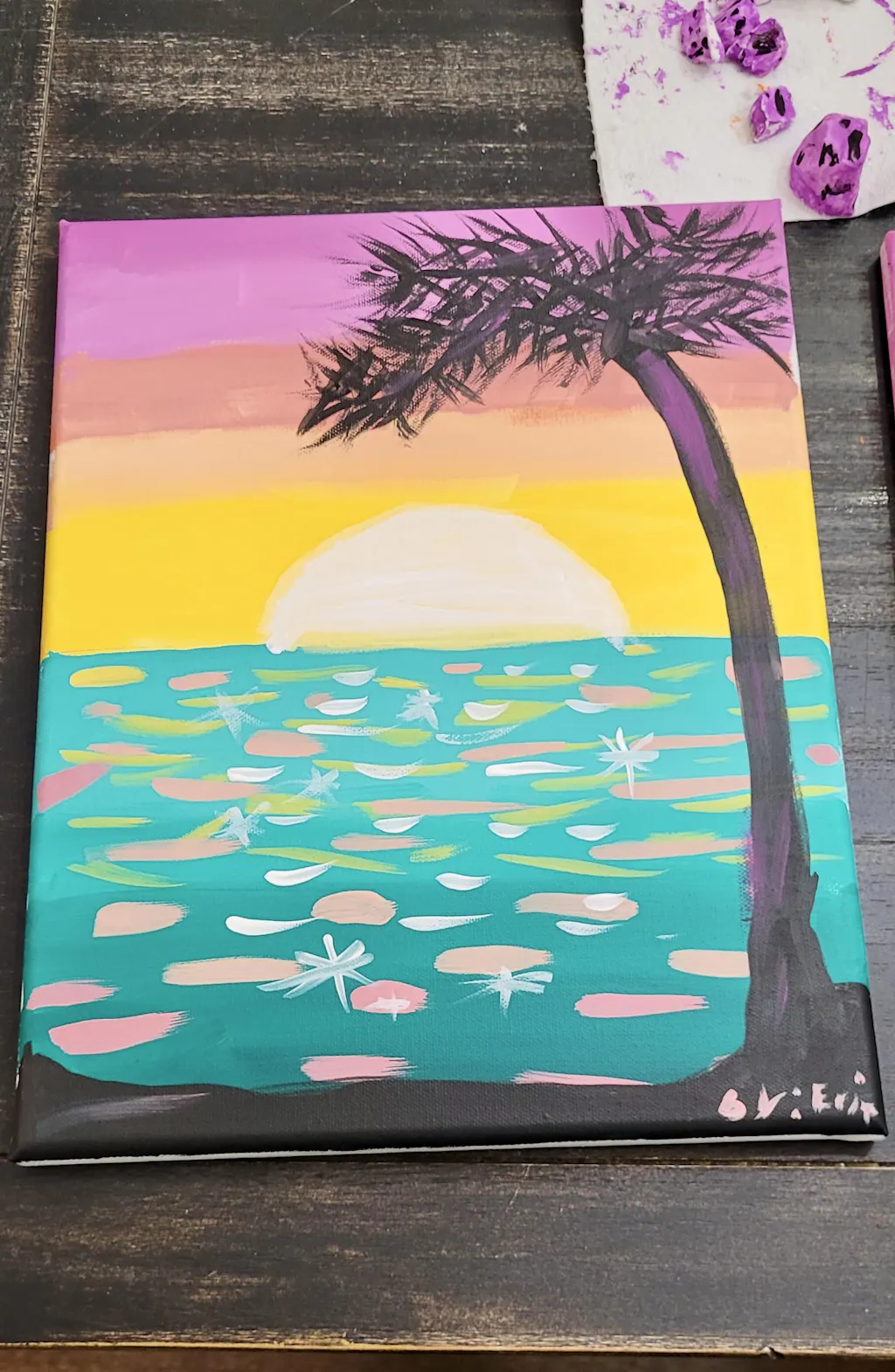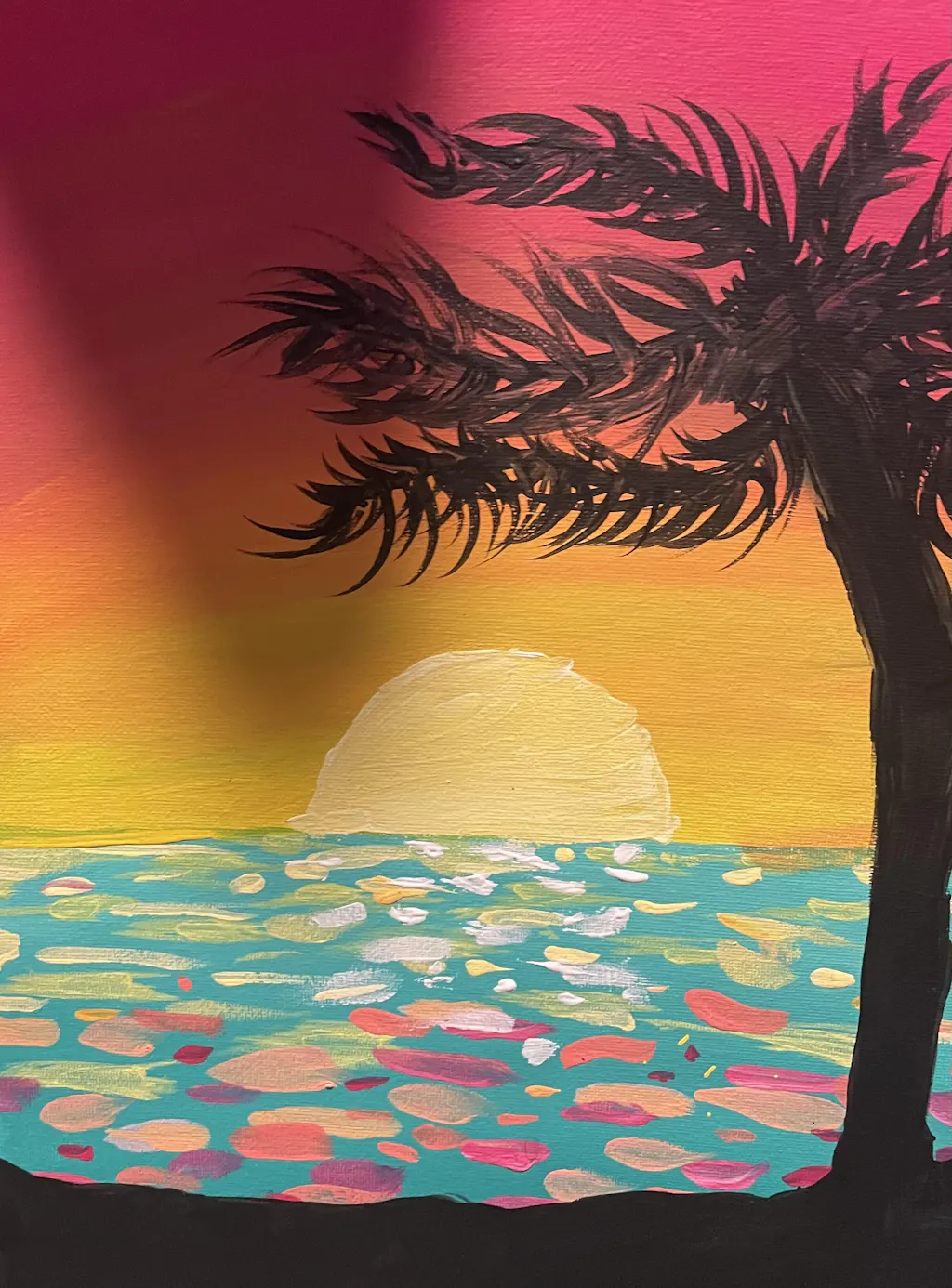 Do you hear the horizon calling? This painting is for you! Adventure awaits as you set sail from this tropical island paradise across the sparkling sea. On this creative journey, you’ll learn how to blend colors for a vibrant sunset sky, add realistic reflections to water, and build the silhouette of a palm tree swaying in the breeze one brush stroke at a time.