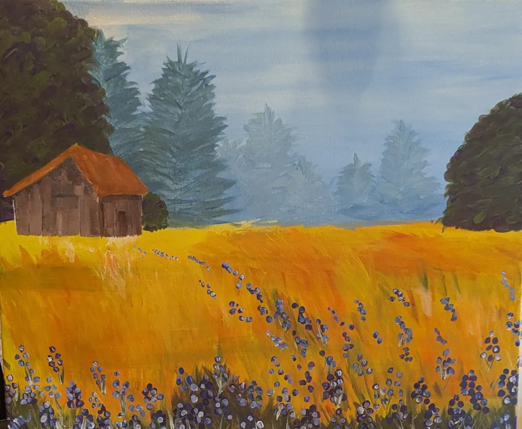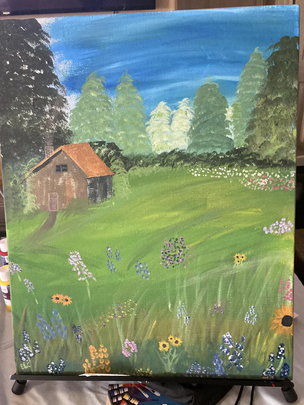 Nestled high in the mountains, the meadow beside this rustic cabin is the perfect place for gathering wildflowers! Learn how to use color to create a sense of space, and dot the waving grass with as many flowers as you please in this breezy country landscape.