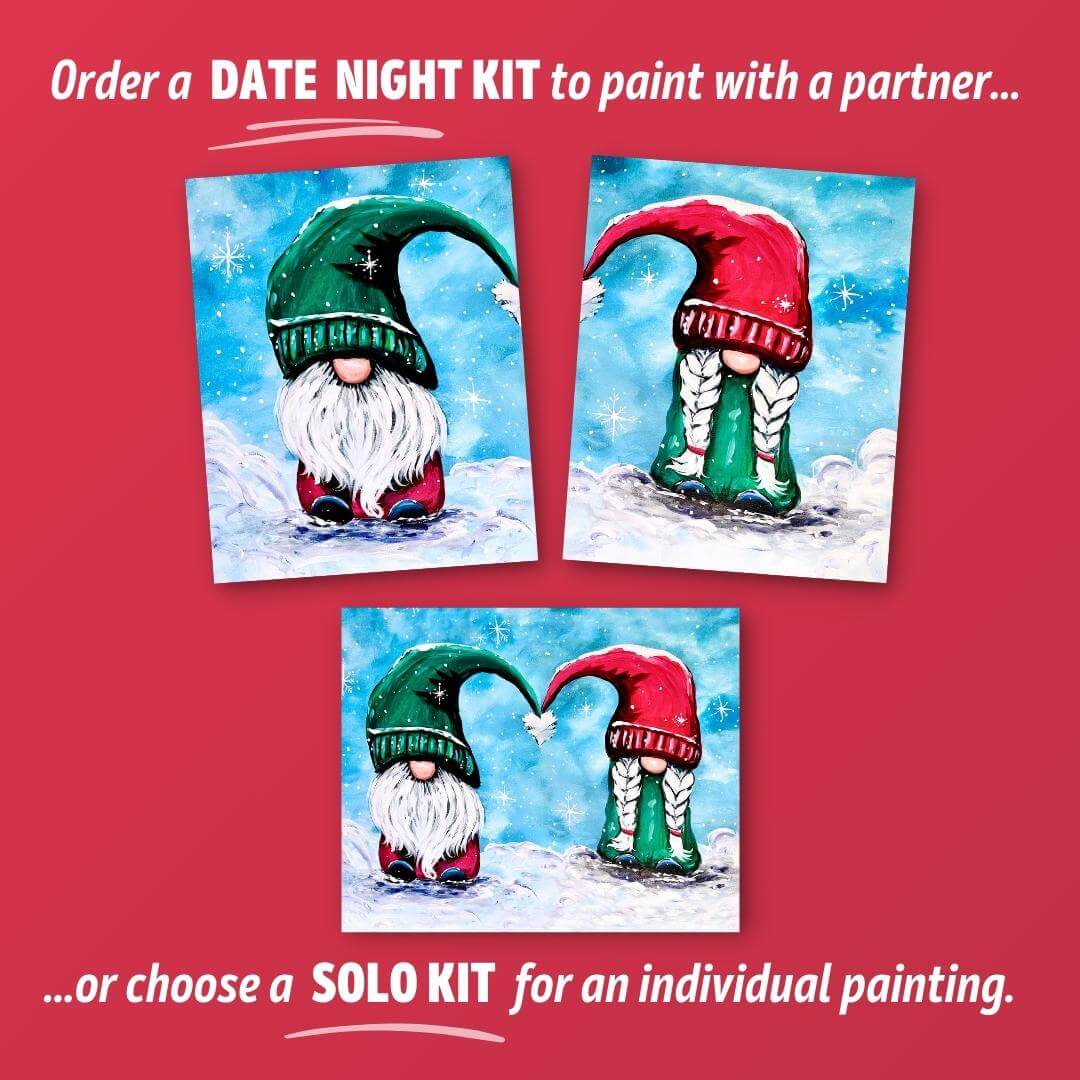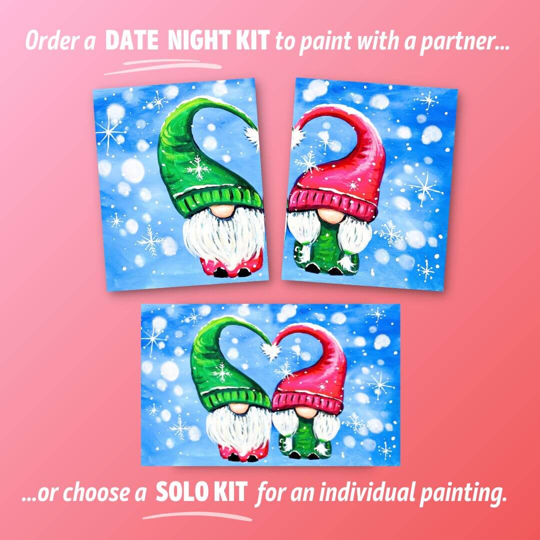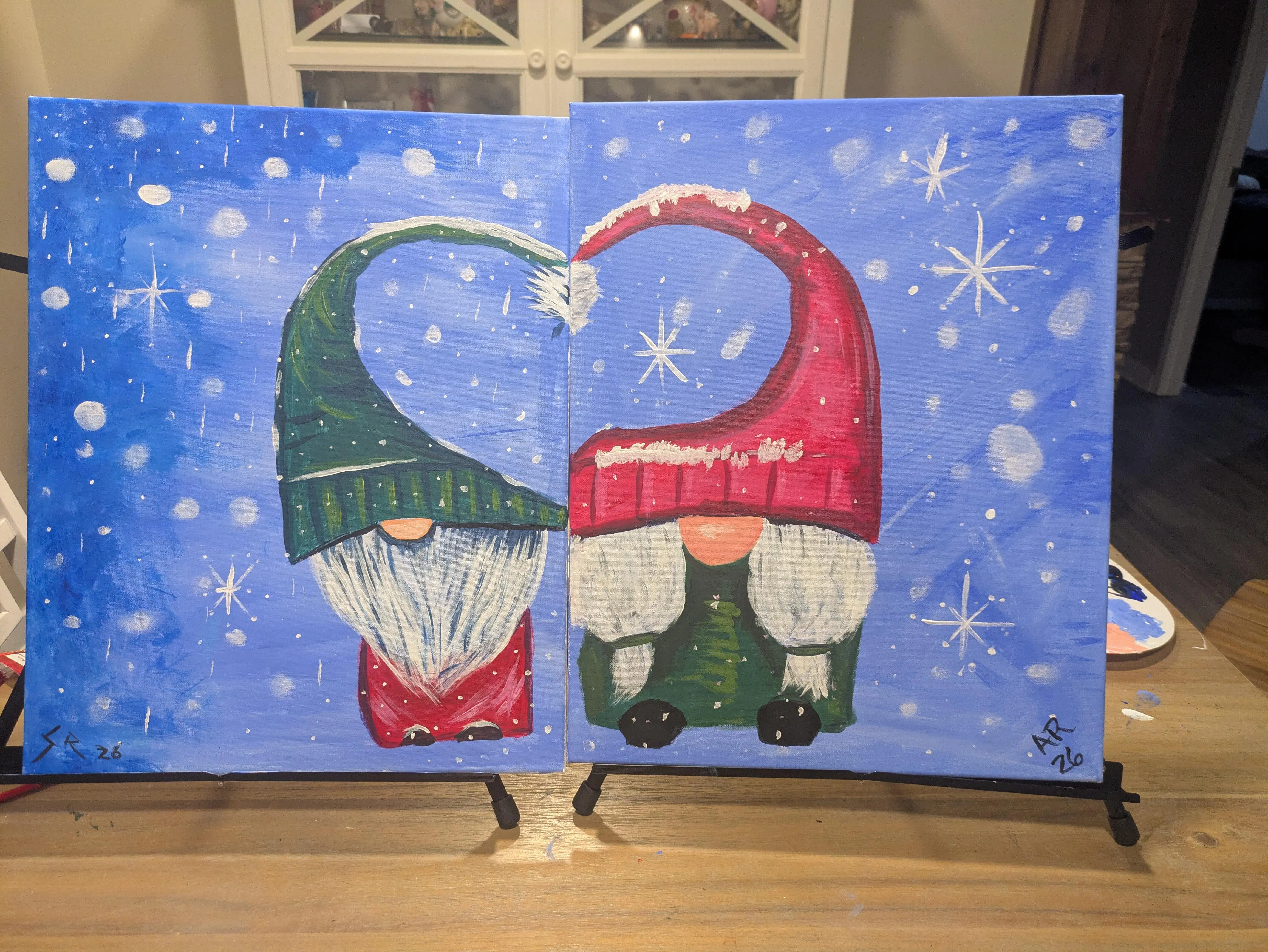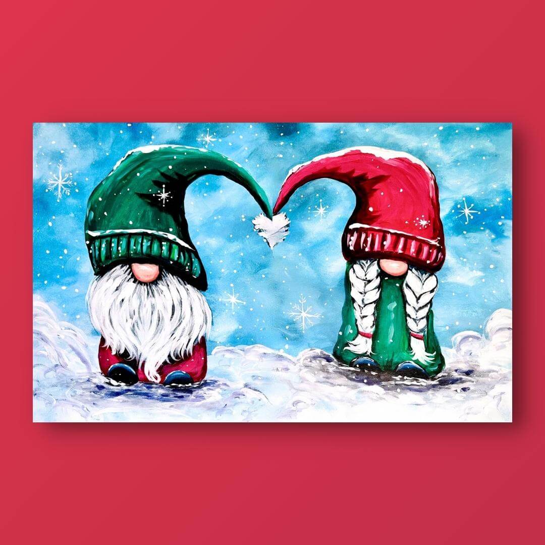 My Christmas wish is… to paint with you! Grab your favorite painting partner, bundle up, and create these cute gnomes who look like they’d be right at home at the North Pole! Customize your gnomes any way you like. Paint both together on one canvas for a solo painting, or collaborate with a partner across two canvases for a pair of masterpieces that clearly belongs together, just like the two of you!